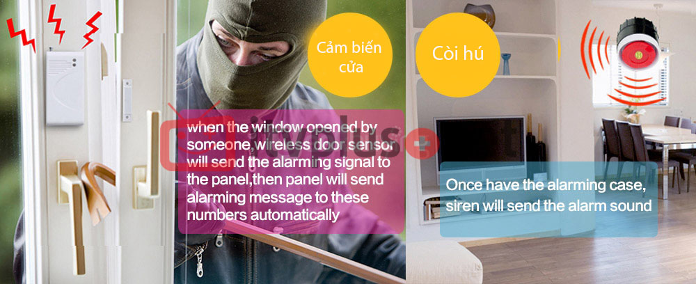 - Có thể cài sẵn 5 số SMS: khi báo động, hệ thống sẽ gửi SMS