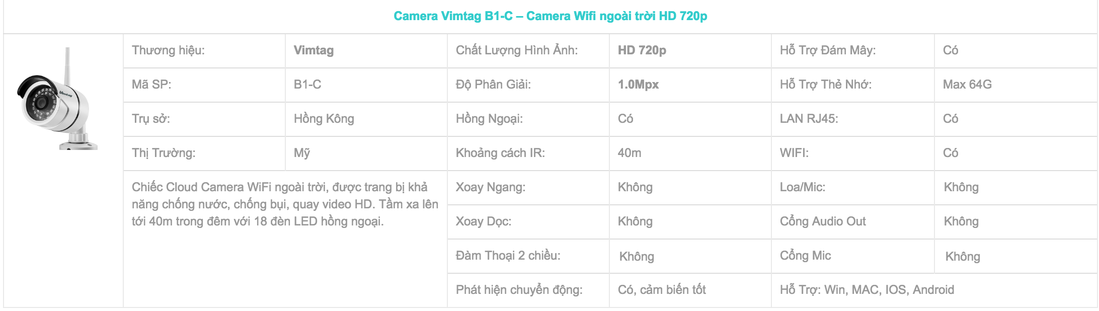 Camera Vimtag B1-C là chiếc camera đám mây thông minh mini ngoài trời được trang bị ống kính quang HD 720p cho hình ảnh chất lượng HD 1.0 Megapixel. Chiếc camera nhỏ gọn bé hơn kích thước 1 chiếc điện thoại iPhone 5, với khả năng chống nước, chống bụi, giúp nâng cao tính linh hoạt lắp đặt mọi nơi mọi chỗ thích hợp với nhiều môi trường ngoài trời. Công nghệ điện toán đám mây giúp camera S1 đồng bộ thông minh với trình duyệt PC hoặc điện thoại thông minh, giúp người dùng kiểm soát hình ảnh video mọi lúc mọi nơi dù ở bất kỳ đâu trên thế giới. Điều khiển chế độ zoom 4x ngay trên điện thoại thông minh hoặc trình duyệt giúp xem những chi tiết video sáng và rõ nét.