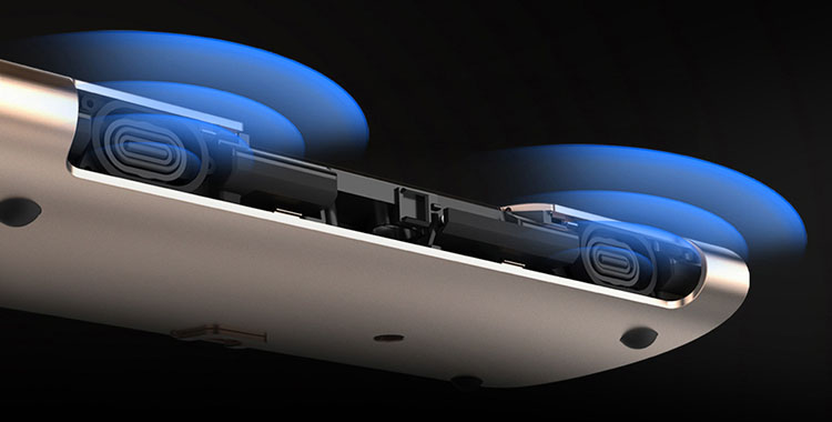 + Công nghệ loa kép được tích hợp phía trước hai bên mắt hồng ngoại hướng về phía người dùng mang lại chất lượng âm thanh rất ổn, đặc biệt khi thưởng thức các bộ phim hành động hay các bản nhạc sôi động. JMGO M6 có thể coi như một chiếc loa di động rất phù hợp khi đi du lịch vì tần số tiếng ồn chỉ rơi vào khoảng 30dB