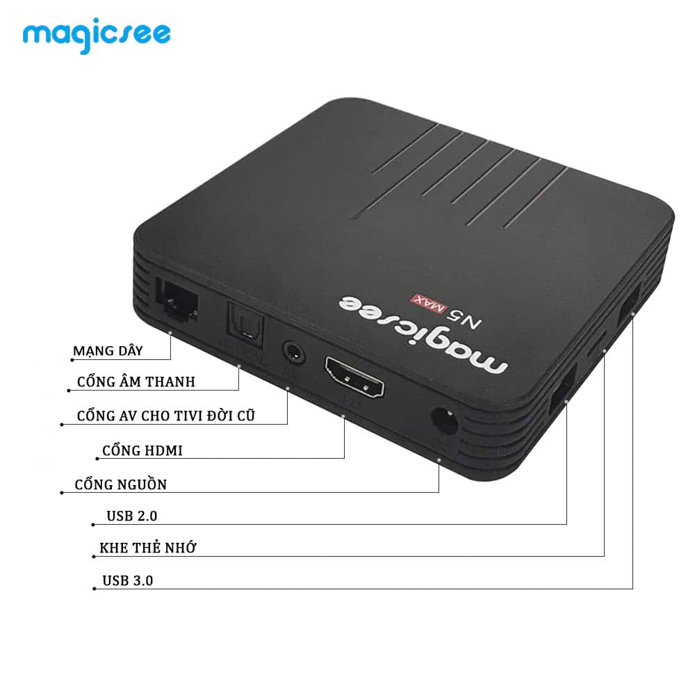 – Magicsee N5 max được trang bị đầy đủ các cổng kết nối từ AV dành cho tivi đời cổ và amply cho đến các cổng kết nối HDMI , âm thanh optical , cổng mạng lan , cổng USB 2.0 và 3.0 , khe cắm thẻ nhớ TF Card tất cả đều có đủ trên Magicsee N5 max.