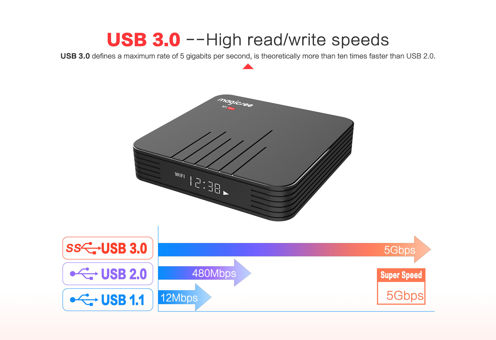Thiết bị có Hỗ trợ USB 3.0 cho tốc độ truyền tải 5 Gbps / giây nhanh gấp 10 lần USB 2.0 . Không nhiều android tv box có hỗ trợ cổng kết nối usb 3.0 như Magicsee n5 max . Có thể xem đây là 1 điểm đáng tiền trên N5 max .