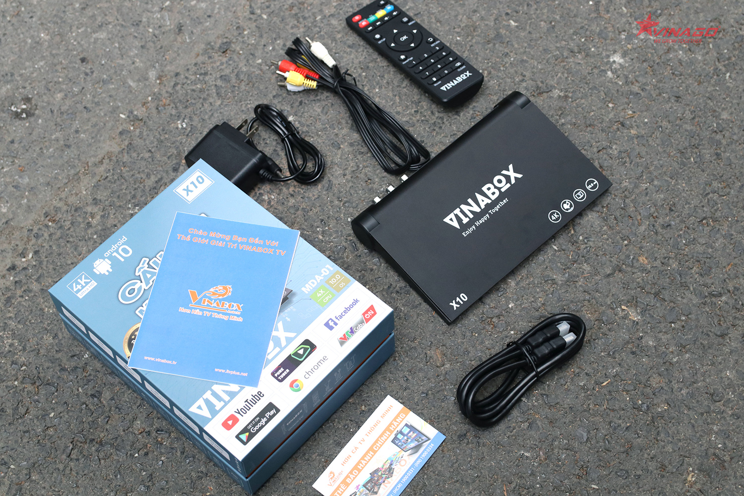 Phụ Kiện VINABOX X10 Gồm Có: Nguồn, cable HDMI, cable AV, Remote, Hướng Dẫn Sử Dụng.