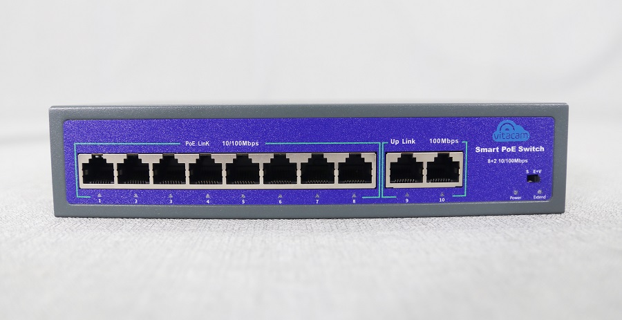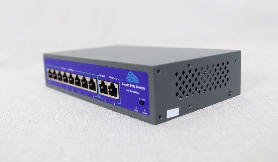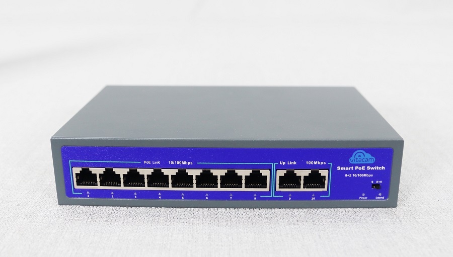 - Switch PoE Vitacam 8 port có cổng Ethernet 8 * 100Base T (X) POE và cổng cáp quang SFP 2 * 1000Base-X và cổng kết nối 2 cổng Gigabit.