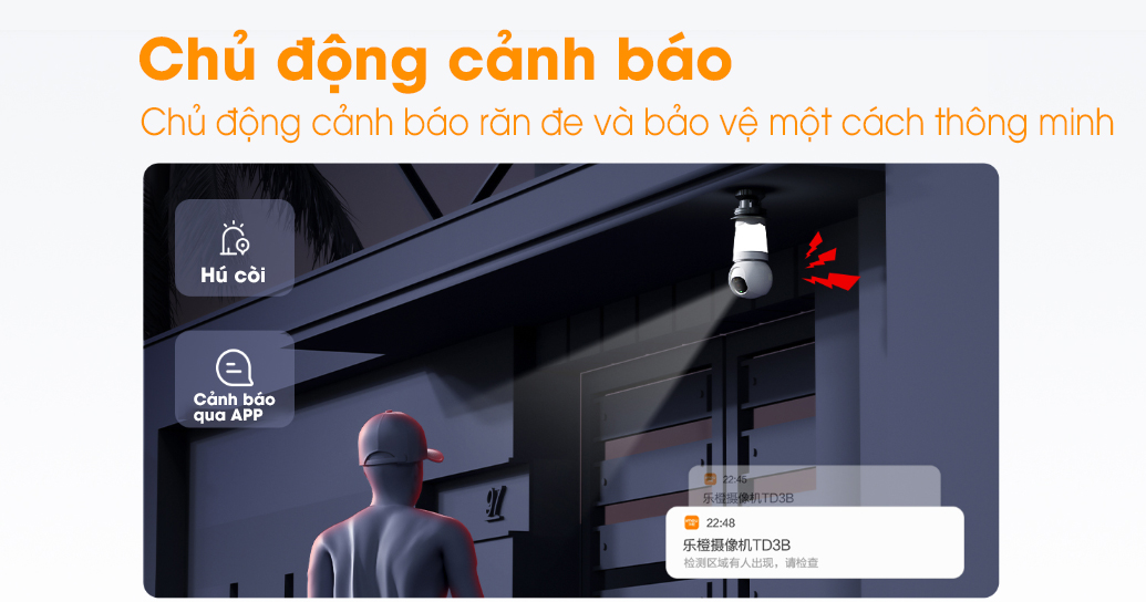 Sau khi chế độ cảnh báo được bật , camera sẽ Bảo vệ chủ động ngôi nhà của bạn một cách thông minh với còi hú, nhá đèn và cảnh báo qua APP về điện thoại cho người dùng