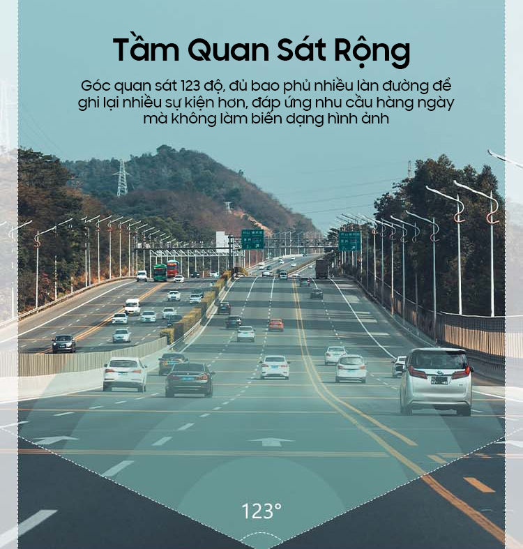 Góc quan sát lên tới 123 độ, đủ bao phủ nhiều làn đường để ghi lại nhiều sự kiện hơn, đáp ứng nhu cầu hàng ngày mà không làm biến dạng hình ảnh
