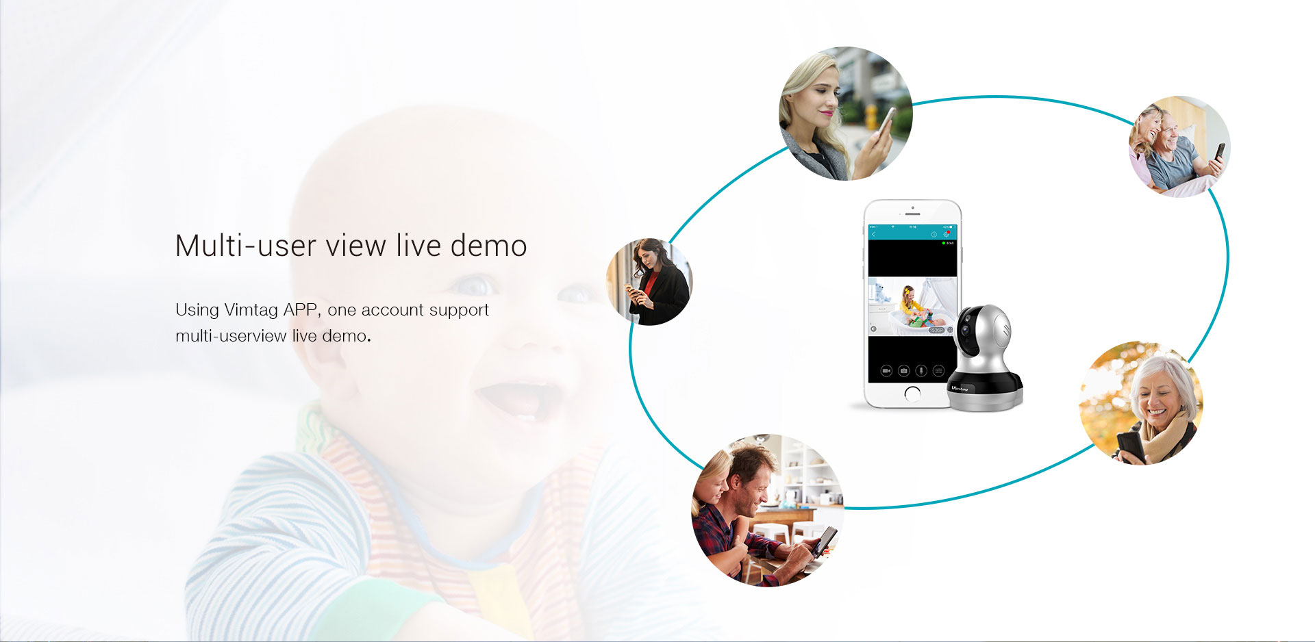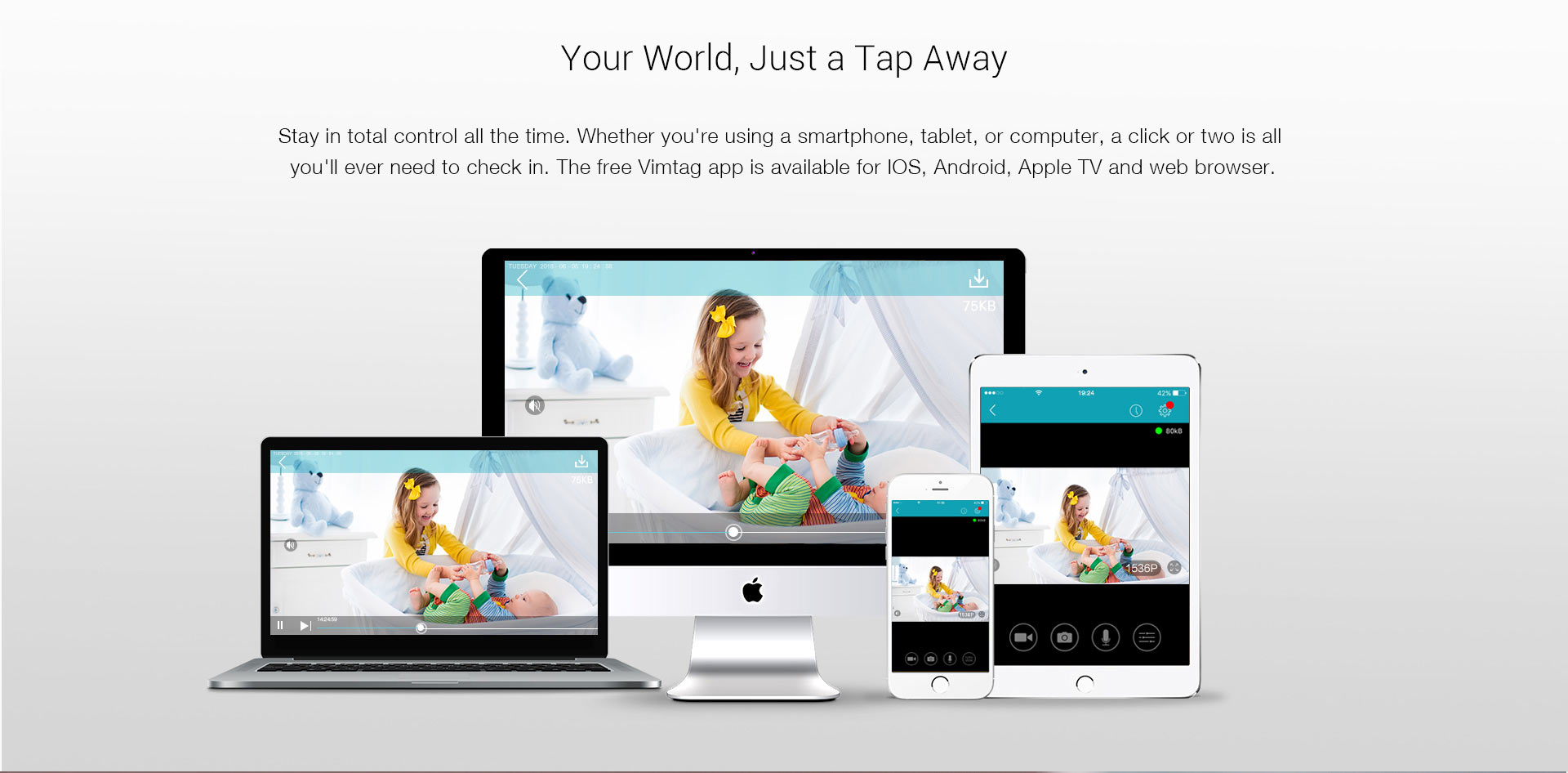 Nhờ một ứng dụng dành riêng cho điện thoại thông minh và máy tính bảng, nhiều người dùng có thể xem video cùng một lúc. Trong trường hợp vượt quá băng thông đầu ra của camera trong mạng cục bộ, việc liên lạc sẽ được thực hiện thông qua đám mây. Chỉ cần cài đặt ứng dụng trên thiết bị của bạn và thêm camera. Bạn cũng có thể sử dụng máy tính. Tất cả những gì bạn phải làm là cài đặt ứng dụng Vimtag cho hệ điều hành Windows.