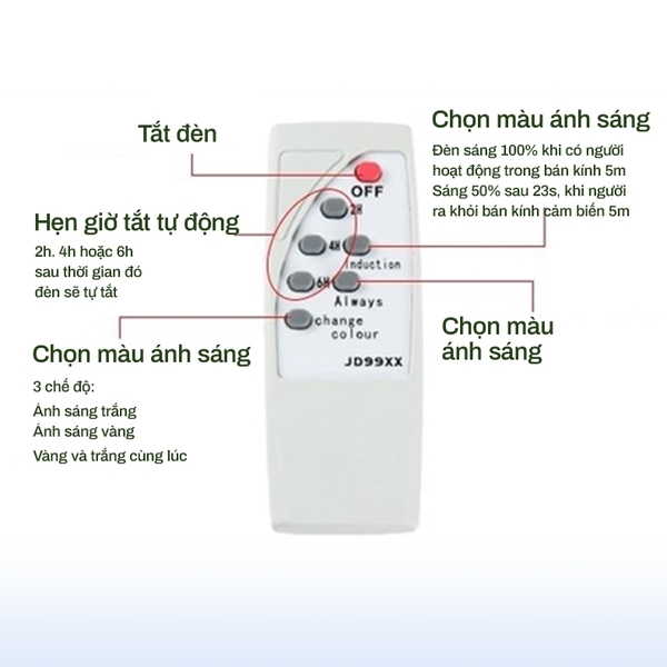 - Chế độ điều khiển: Tích hợp bộ cảm biến ánh sang, tự động bật đèn khi trời tối, tắt đèn khi trời sang + Có điều khiển từ xa.