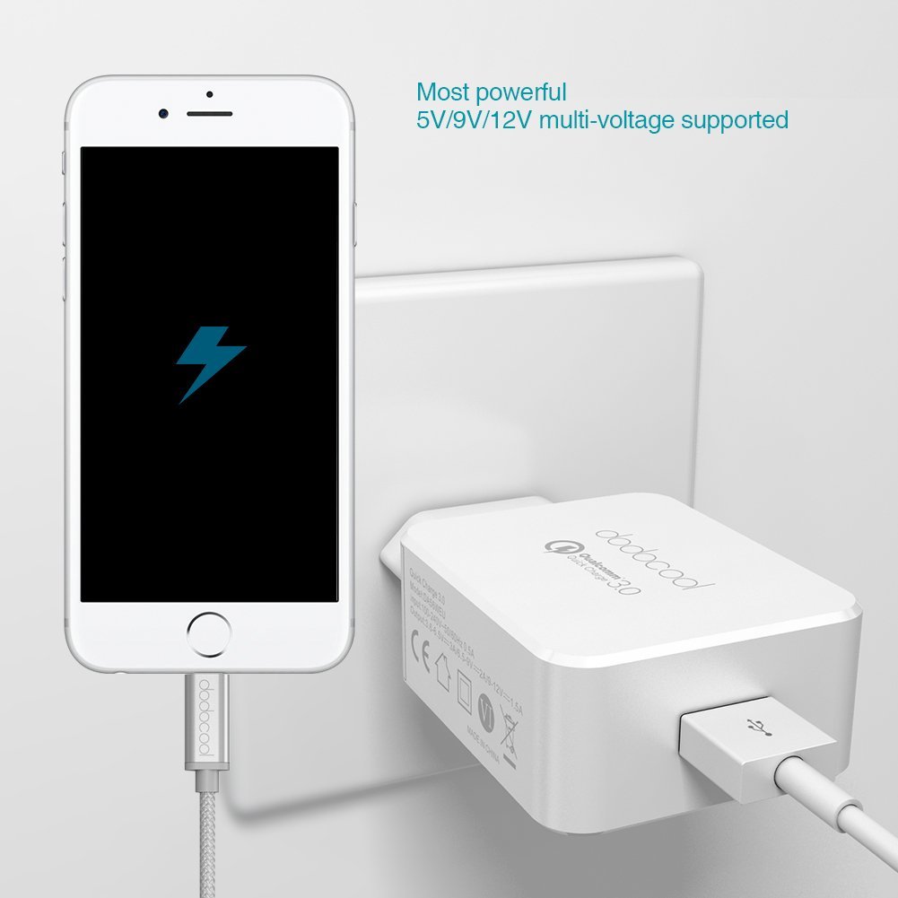 Bộ sạc USB 3.0 của Dodocool QC 3.0 sử dụng thuật toán Thông minh để Tối ưu hóa Điện áp (INOV) và hỗ trợ các lựa chọn điện áp linh hoạt từ 3.6V đến 12V với gia số 200mV, cho phép một Thiết bị di động tự động điều chỉnh đến mức điện áp lý tưởng được hỗ trợ bởi thiết bị đó. Điện áp tối đa là 3.6-6.5V / 3A, 6.5-9V / 2A, hoặc 9-12V / 1.5A.