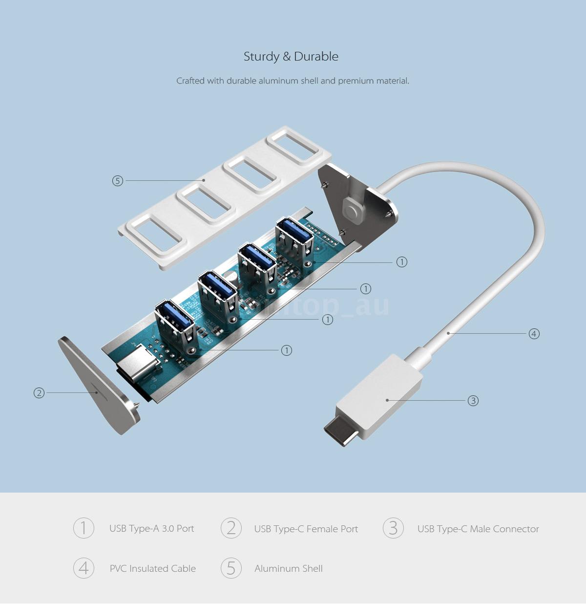 Thiết kế: 4 cổng USB 3.0, 1 cổng USB-C Female (cái), 1 cổng kết nối USB-C (đực)