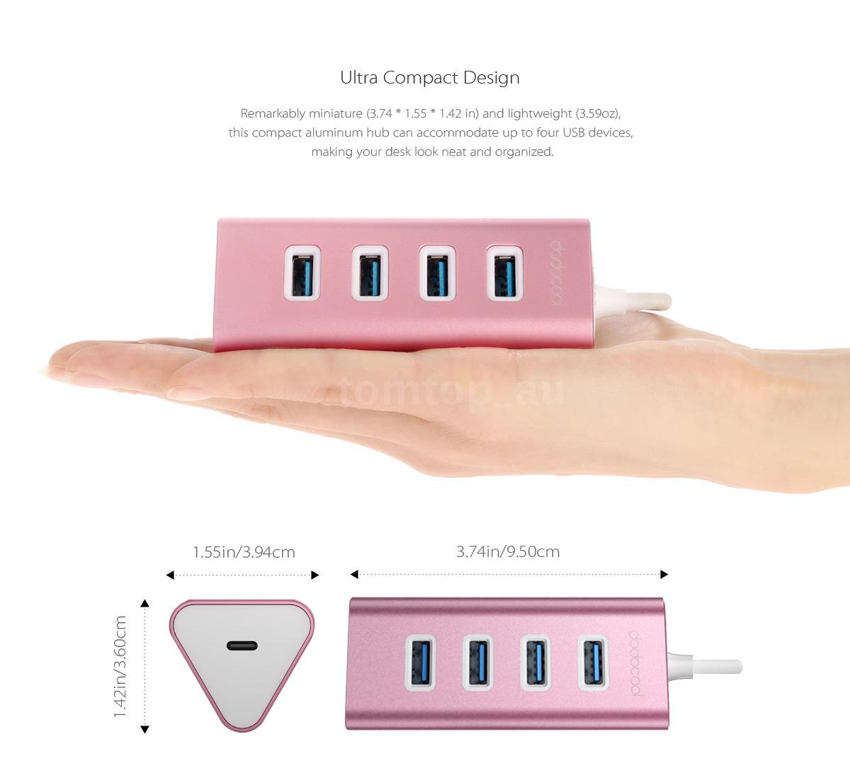 Bộ Hub 4 cổng USB 3.0 và 1 cổng USB-C Female được thiết kế nhỏ gọn. Dễ dàng thêm các cổng kết nối USB cho máy tính xách tay dùng cổng USB Type C, cho phép kết nối tối đa 4 thiết bị USB để đồng bộ hóa hình ảnh, âm nhạc và dữ liệu với tốc độ cao 5Gbps. Cổng USB Female cho phép sạc Macbook đời mới của Apple trong khi vẫn truyền tải dữ liệu qua cổng USB 3.0