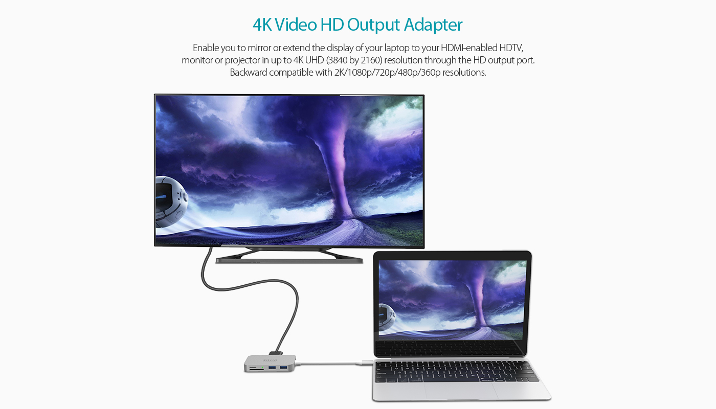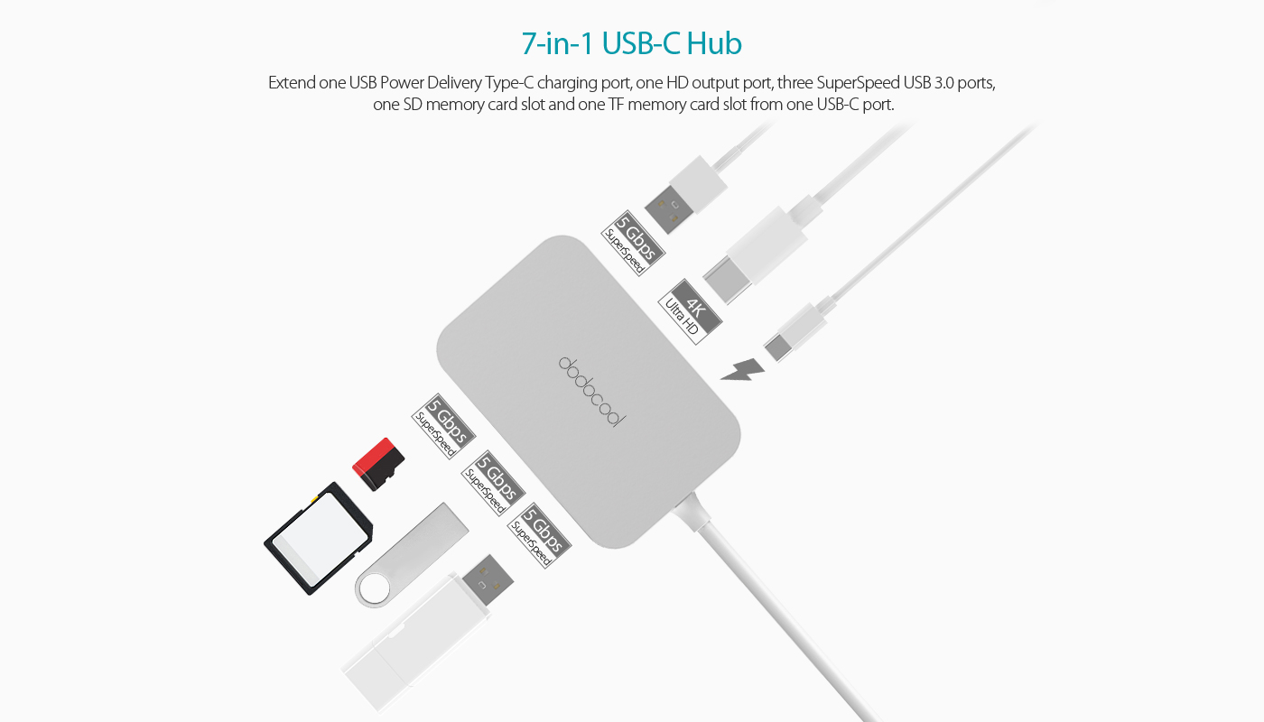 Hub USB-C 7 trong 1 là một giải pháp lý tưởng cho máy tính xách tay hoặc các thiết bị khác trang bị cổng USB-C (hoặc cổng Thunderbolt 3). Nó cho phép bạn sạc MacBook Pro, MacBook, Google Chromebook Pixel hoặc các thiết bị được trang bị cổng USB-C hỗ trợ tính năng Power Delivery trong khi đồng thời streaming video lên đến 4K UHD (3840 bởi 2160) với TV, máy chiếu. Chuyển giao Tập tin thông qua cổng USB 3.0 và khe thẻ nhớ.