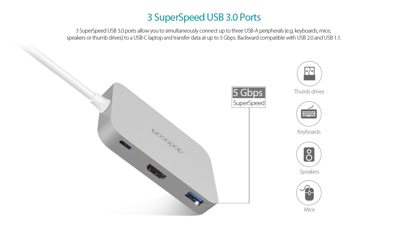 Với 3 cổng USB 3.0 tốc độ cao cho phép bạn kết nối đồng thời ba thiết bị ngoại vi USB-A (ví dụ: bàn phím, chuột, loa hoặc ổ cắm) vào máy tính xách tay USB-C và truyền dữ liệu với tốc độ lên tới 5 Gbps. Tương thích ngược với USB 2.0 và USB 1.1.