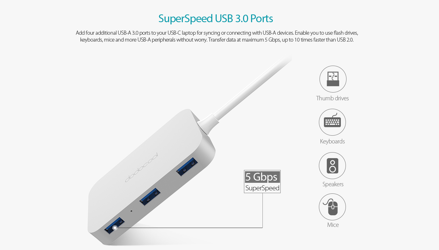 Dodocool DC31 Bổ sung bốn bổ sung USB-A 3.0 cổng để của bạn USB-C máy tính xách tay cho đồng bộ hoặc kết nối với USB-A thiết bị. cho phép bạn sử dụng flash drives, bàn phím, chuột và nhiều hơn nữa USB-A thiết bị ngoại vi mà không cần lo lắng. Chuyển dữ liệu tối đa 5 Gbps, lên đến 10 lần nhanh hơn so với USB 2.0.