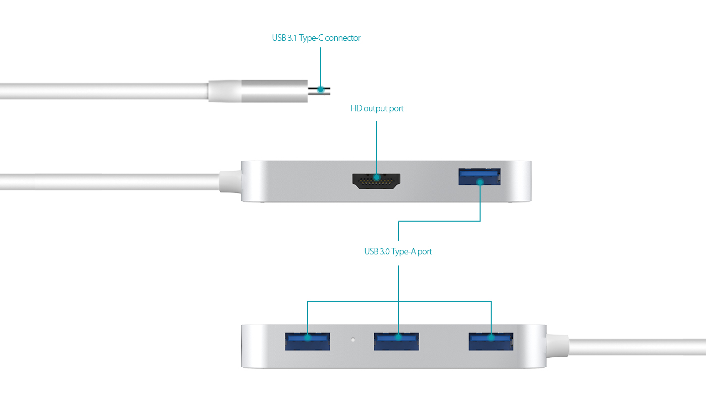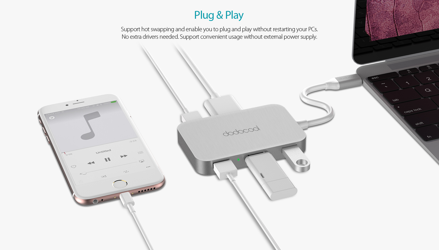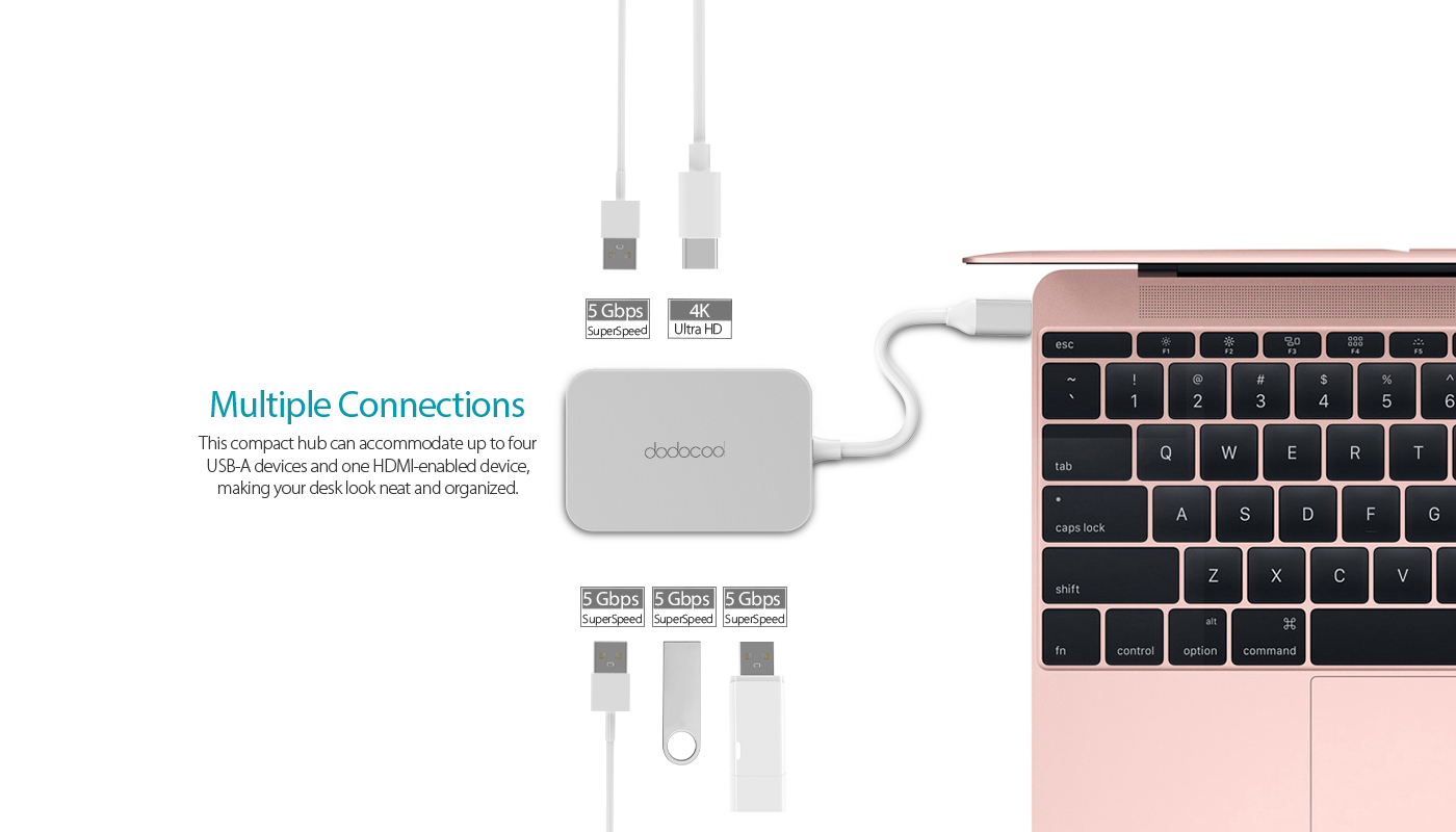 Dodocool DC31 làm bằng Hợp Kim Nhôm , bộ chuyển USB-C sang USB 3.0 và HDMI ,để trình chiếu hoặc chuyền tải dữ liệu với HD Cổng Đầu Ra cung cấp bốn USB 3.0 Type-A cổng và một HD cổng đầu ra thông qua một đơn USB-C port on của bạn PCs. mỗi USB 3.0 cổng hỗ trợ tốc độ truyền dữ liệu lên đến 5 Gbps. các HD cổng đầu ra cho phép bạn để phản ánh của bạn USB-C máy tính xách tay hiển thị để HDMI của bạn-kích hoạt TRUYỀN HÌNH hoặc màn hình với độ phân giải lên đến 4 K. dễ tháo lắp, plug and play và không có trình điều khiển cần thiết. đó là một lý tưởng mở rộng giải pháp cho máy tính xách tay với một USB-C port.