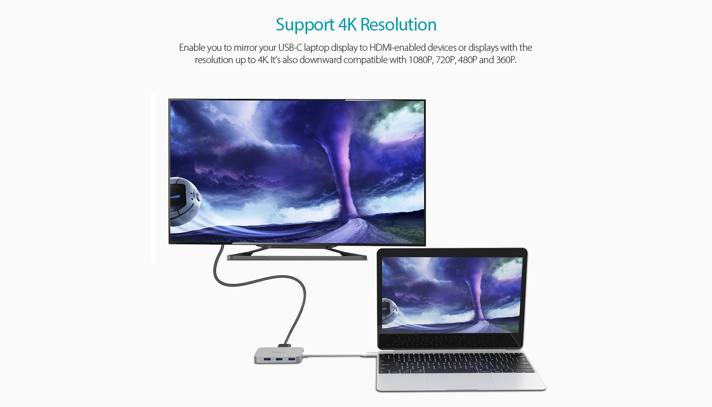 cho phép bạn trình chiếu các nội dung Video , thuyết trình của bạn qua USB-C của máy tính xách tay hiển thị lên các màn hình lớn hơn như TV , Máy chiếu với độ phân giải lên đến 4 K. Nó của cũng tương thích ngược với 1080 P, 720 P, 480 P và 360 P.