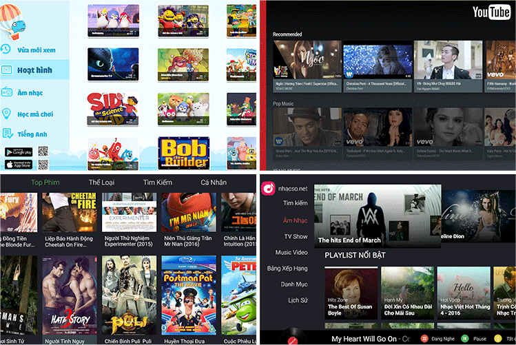 Tích hợp các ứng dụng cực "chất" hỗ trợ nghe nhạc, xem phim, truy cập Youtube và nội dung thiếu nhi đặc sắc.