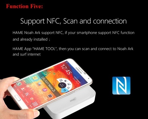 HAME A19 được bổ sung thêm công nghệ NFC (Near Field Communication). NFC có thể thay thế việc thiết lập bắt buộc phải kết nối WiFi với mã PIN, bằng việc để smartphone và HAME A19 cạnh nhau để kết nối vào mạng WIFI không dây. Yêu cầu để làm được điều đó thì smartphone phải hỗ trợ tính năng NFC và đã cài đặt HameTool.
