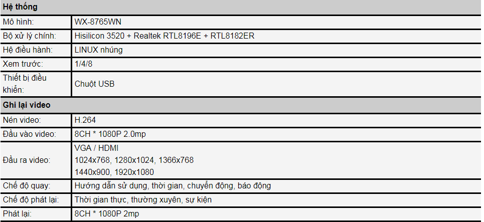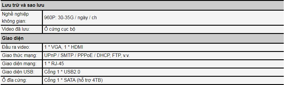 Thông số kỹ thuật của bộ Kit HKcam HD NVR K960820: