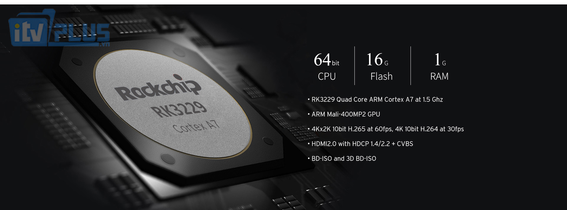 Thông số HIMEDIA H1 Plus:Chip CPU RK3229 Quad Core, 64 Bit,Ram 1G, Rom 16G, HDMI 2.0, Android 5.1