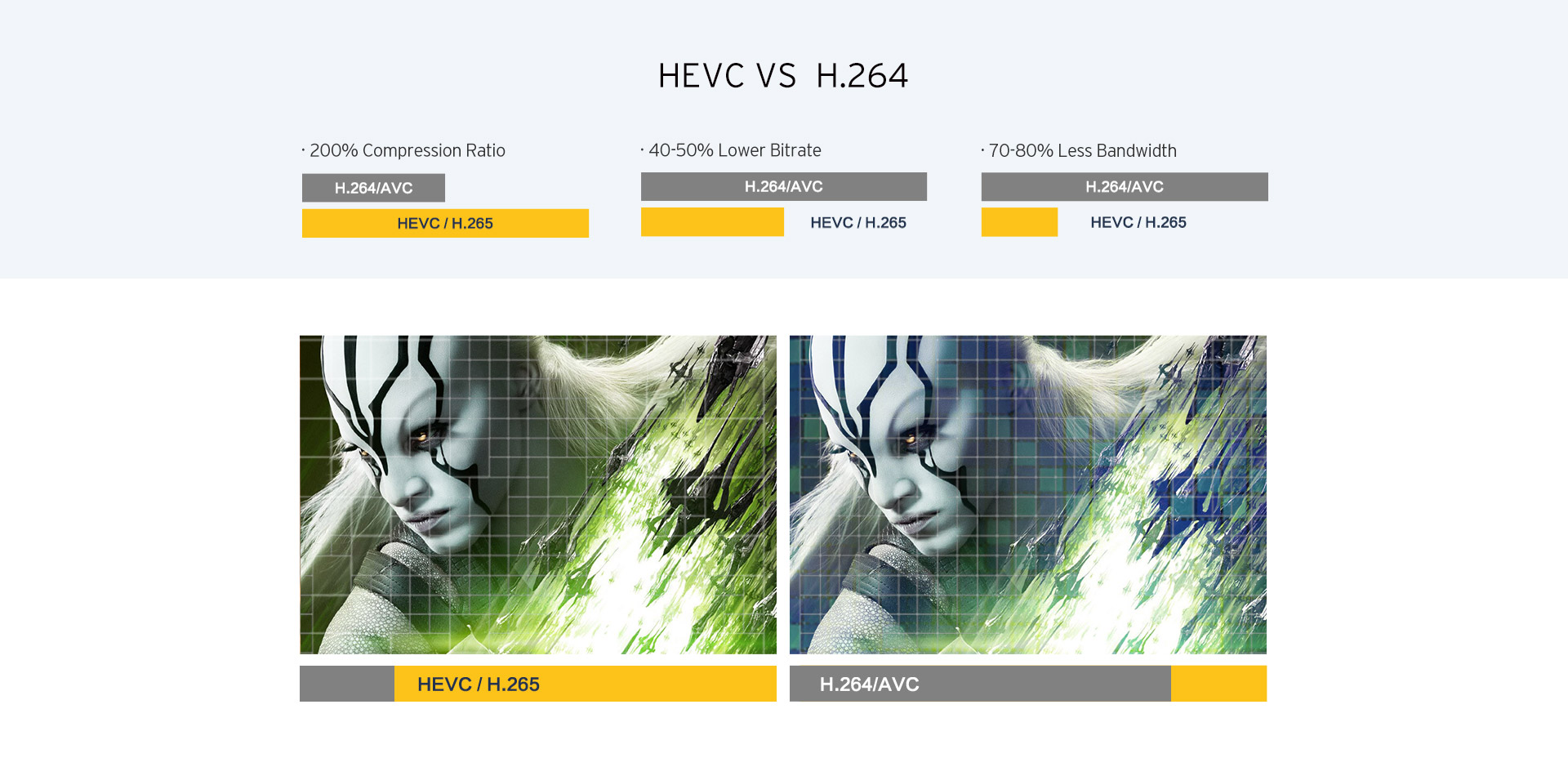 H.265 là một chuẩn nén video thế hệ mới từ H.264, H265 có thể khả năng gấp đôi tỷ lệ nén dữ liệu so với chuẩn nén H.264 ở cùng chất lượng hình ảnh. So sánh với H.264, H265 có thể truyền dữ liệu ở cùng chất lượng video bằng một băng thông, so đó người dùng có thể thưởng thức những video độ phân giải cao, thậm chí ngay cả môi trường tốc độ mạng internet rất chậm.