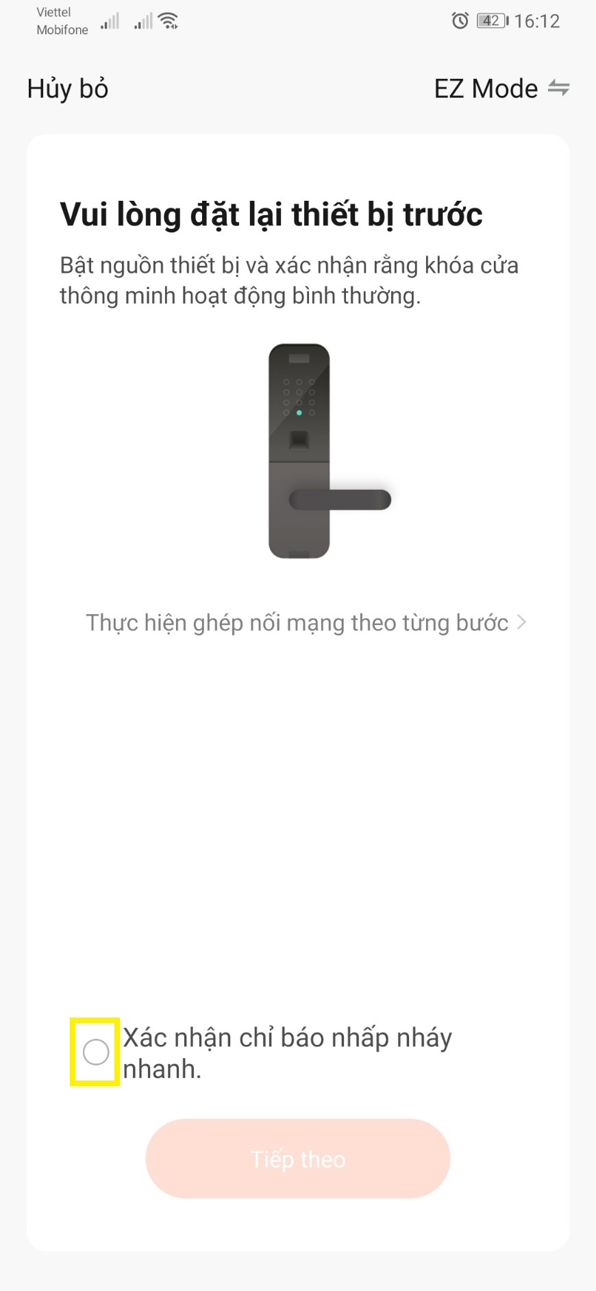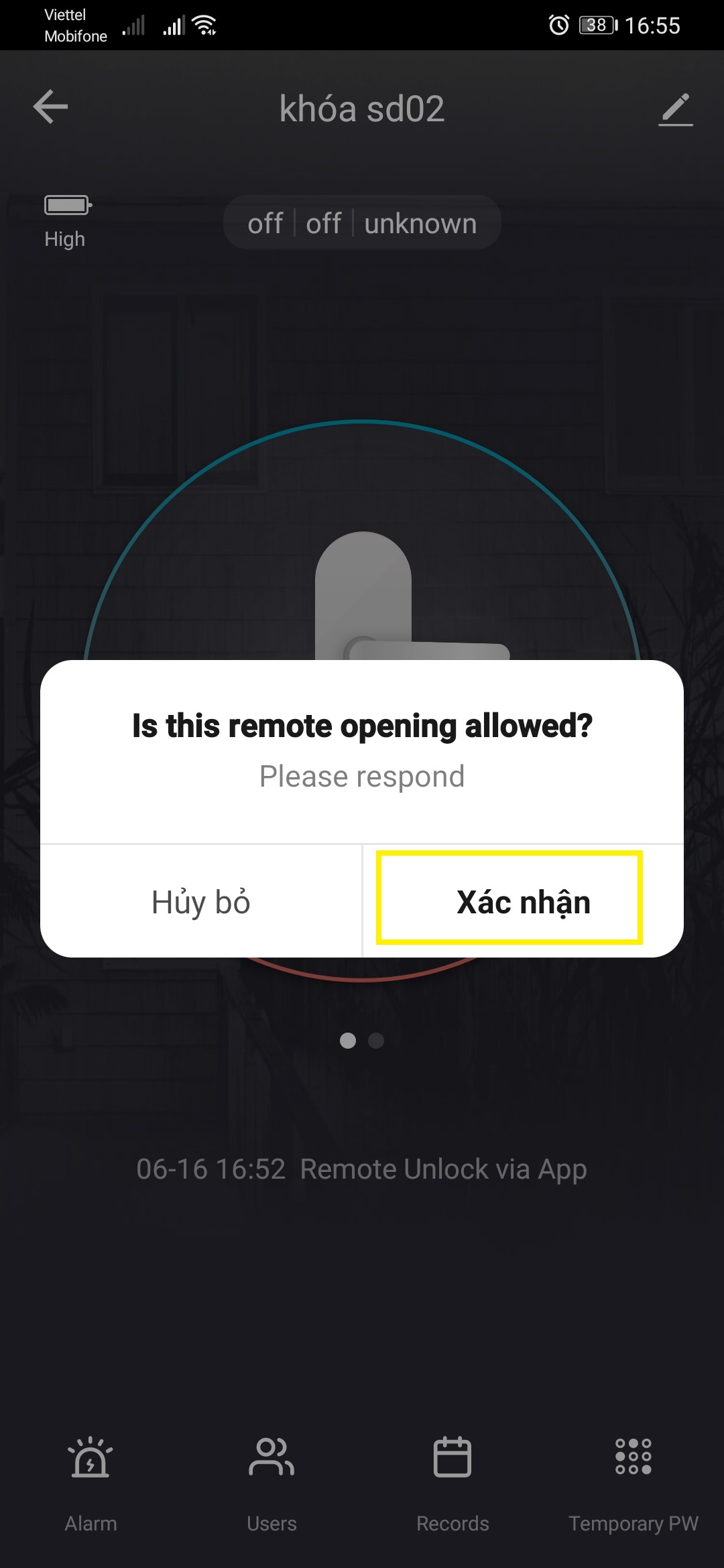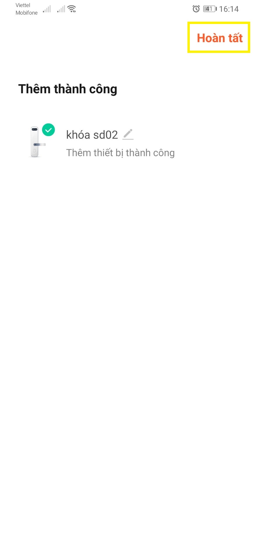 Bước tiếp theo trên app sẽ yêu cầu chúng ta mở khóa chúng ta thao tác Nhập phím *#  → Khóa phát ra giọng nói: “please enter administator infomation” → nhập vân tay admin hoặc mật khẩu admin hoặc thẻ từ admin. Sau khi đăng nhập thực hiện các chức năng theo hướng dẫn của khóa và thao tác lần lượt như sau : ấn " 1 " thiếp theo ấn " 3 " và ấn " 1 ". Sau khi thấy số 0 trên khóa nhấp nháy chúng ta ấn "xác nhận" trên điện thoại và đợi tầm 1 phút để khóa tự dộng kết nối với wifi và app trên điện thoại sau khi kết nối thành công chúng ta chọn vào phần tên để đổi tên và ấn chọn " Hoàn tất " để kết thúc.