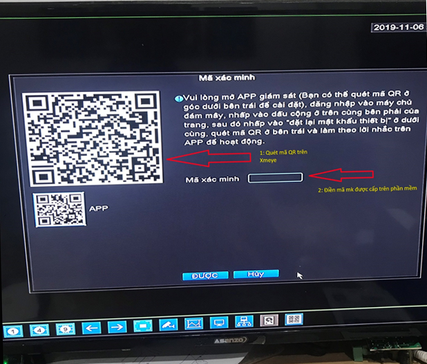 Sau khi đã xuất hiện mã QR code của đầu ghi các bạn có thể sử dụng xmeye để quét mã QR code để phần mềm hiển thị mã xác minh. Nhập dãy mã code mà phần mềm gửi cho bạn vào ô mã xác minh trên giao diện mà hình và ấn “Được”