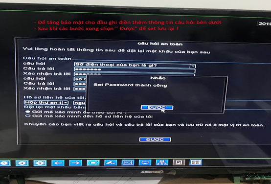 Sau khi nhập thành công mã xác minh thì trên màn hình hiển thị sẽ cho các bạn các giao diện để điền mật khẩu mới và câu hỏi bảo mật mới cho thiết bị và chọn mục “Được” để lưu lại toàn bộ mật khẩu và câu hỏi bảo mật vừa set xong cho thiết bị.