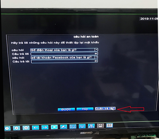 Sau khi kích vào dấu “?” trên màn hình giao diện sẽ hiển thị các câu hỏi bảo mật. Nếu bạn còn nhớ câu hỏi bảo mật có thể trả lời đúng câu hỏi bảo mật để lấy lại mật khẩu đã mất cho đầu ghi. Trong trường hợp không nhớ câu hỏi bảo mật bạn có thể ấn chọn dòng “Quên trả lời?” để đầu ghi hiển thị mã QR code.