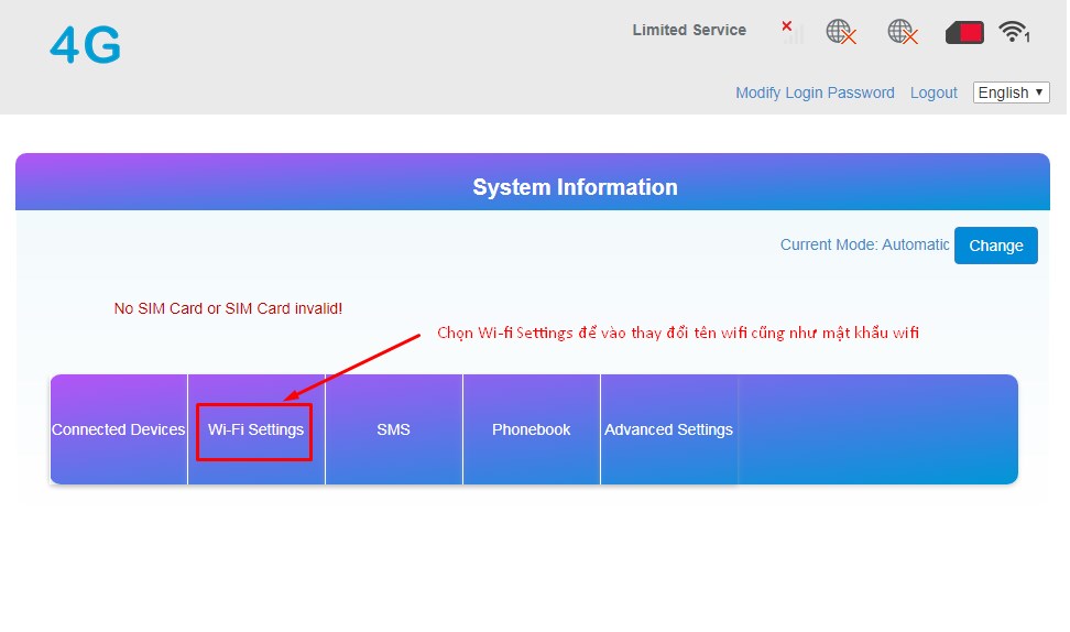 - Hướng dẫn đổi tên wifi và mật khẩu của thiết bị: Tại giao diện cài đặt các bạn làm theo hình bên dưới để thay đổi tên wifi cũng như mật khẩu wifi