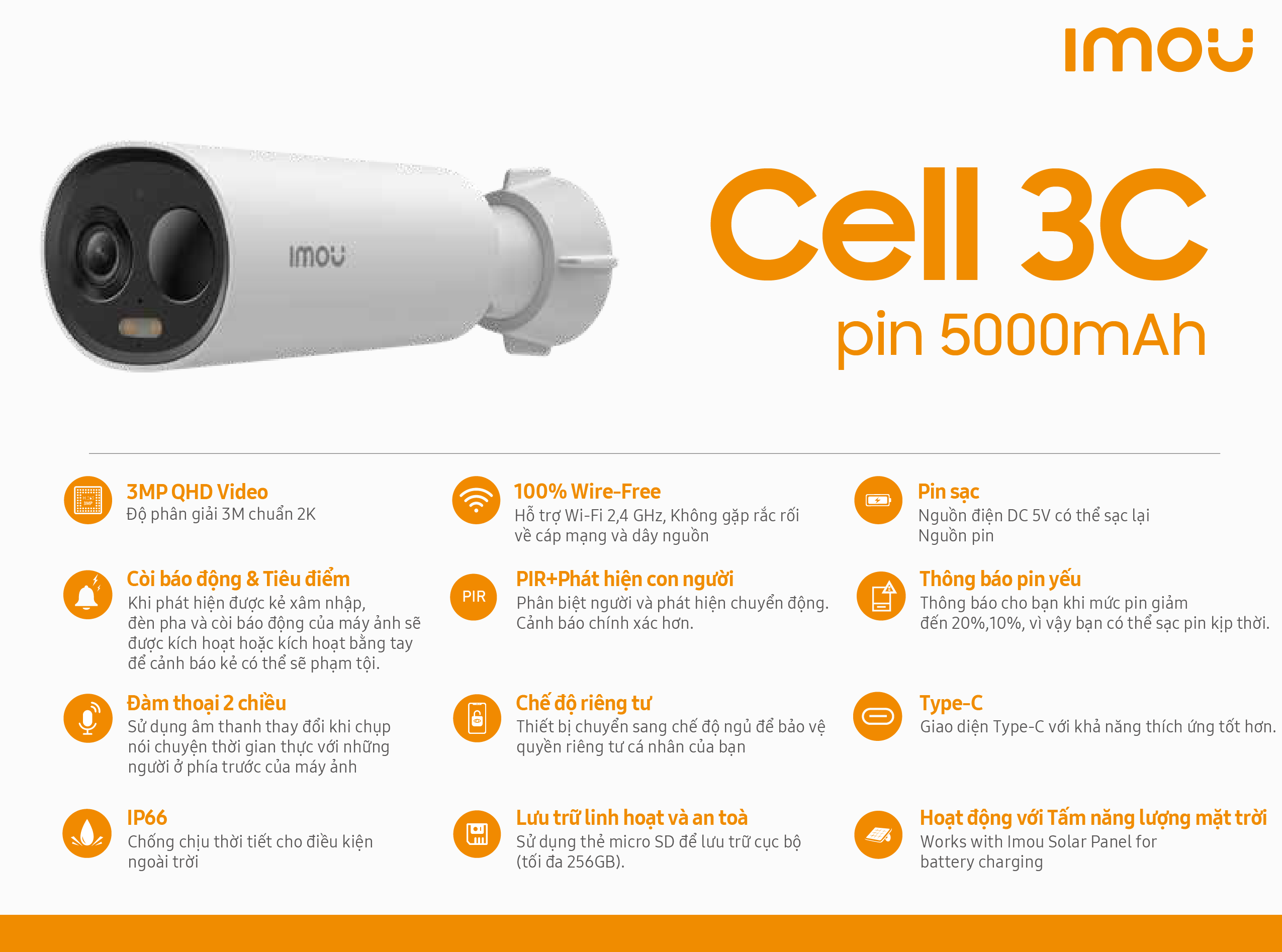 Camera IMOU Cell 3C 3MP 2K là camera an ninh ngoài trời chạy pin của iMOU. Cell 3C 3MP có thể “nhìn thấy” bao quát góc rộng với độ phân giải cực kỳ sắc nét để tự động ghi lại hoạt động gần đó. Với thời lượng pin siêu dài 120 ngày với dung lượng pin cực lớn lên đến 5000mAh