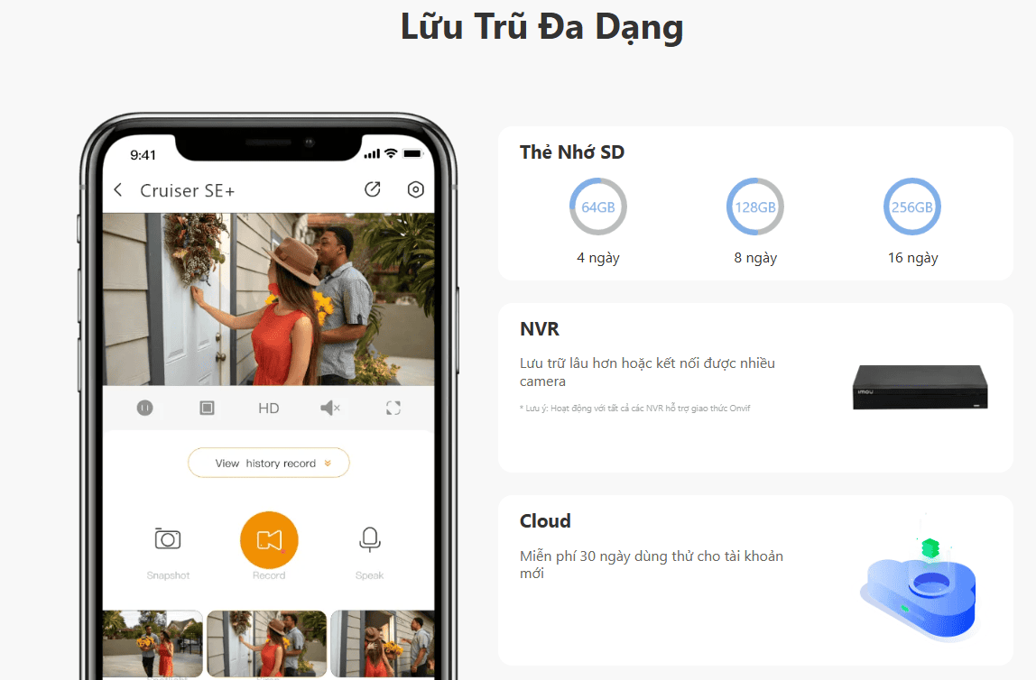 Camera hỗ trợ nhiều phương thức lưu trữ, từ thẻ nhớ đến lưu trữ đám mây, mang lại sự linh hoạt và an toàn cho việc ghi lại các hình ảnh quan trọng.
