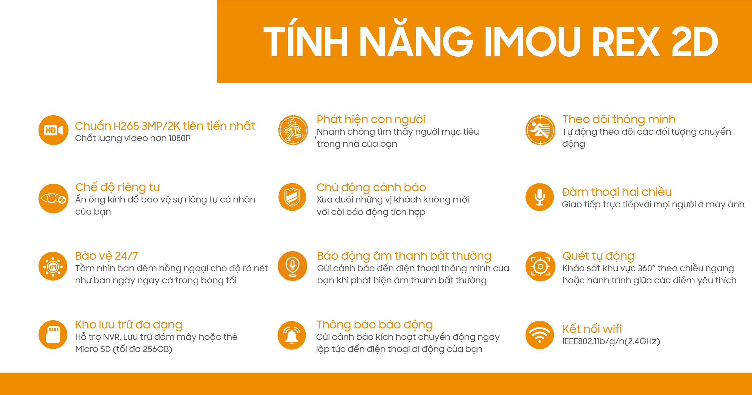 Rex 2D chủ động ngăn những vị khách không mời khỏi những gì bạn quan tâm. Chế độ Quyền riêng tư giúp bảo vệ quyền riêng tư cá nhân của bạn khi bạn ở nhà và chức năng Theo dõi Thông minh cho phép máy ảnh theo dõi các đối tượng chuyển động khi phát hiện chuyển động.