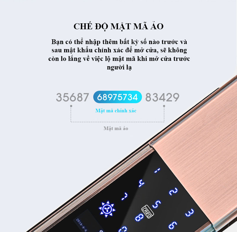 - Công nghệ Mã Số Ảo: cho phép nhập thêm các số trước và sau mã số chống lộ mật khẩu ngay cả khi bị nhìn trực tiếp