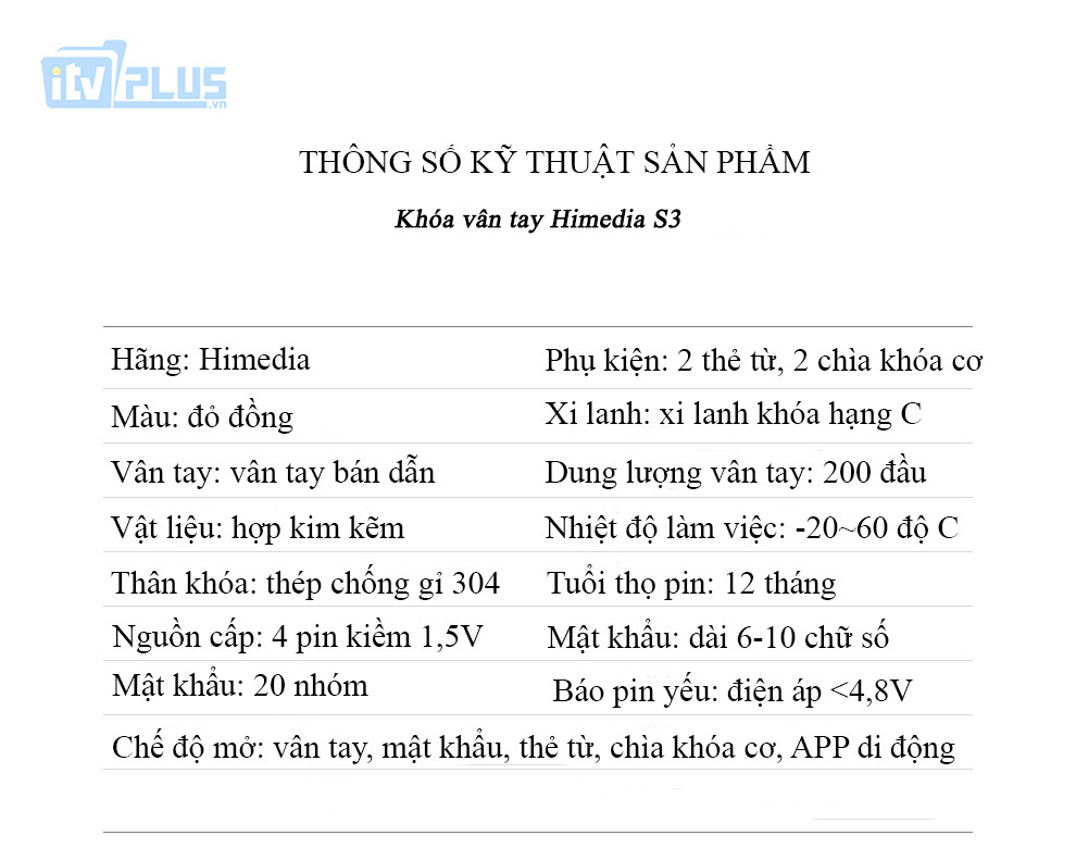 HIMEDIA S3 được itvplus nhập khẩu và phân phối chính hãng tại Việt Nam, sản phẩm được bảo hành 24 tháng, kèm chương trình khuyến mại đặc biệt tặng ngay 01 camera vitacam trị giá 1.200.000 VNĐ cho khách hàng lắp đặt sản phẩm khóa điện tử vân tay HIMEDIA S3 trong dịp tết 2020.