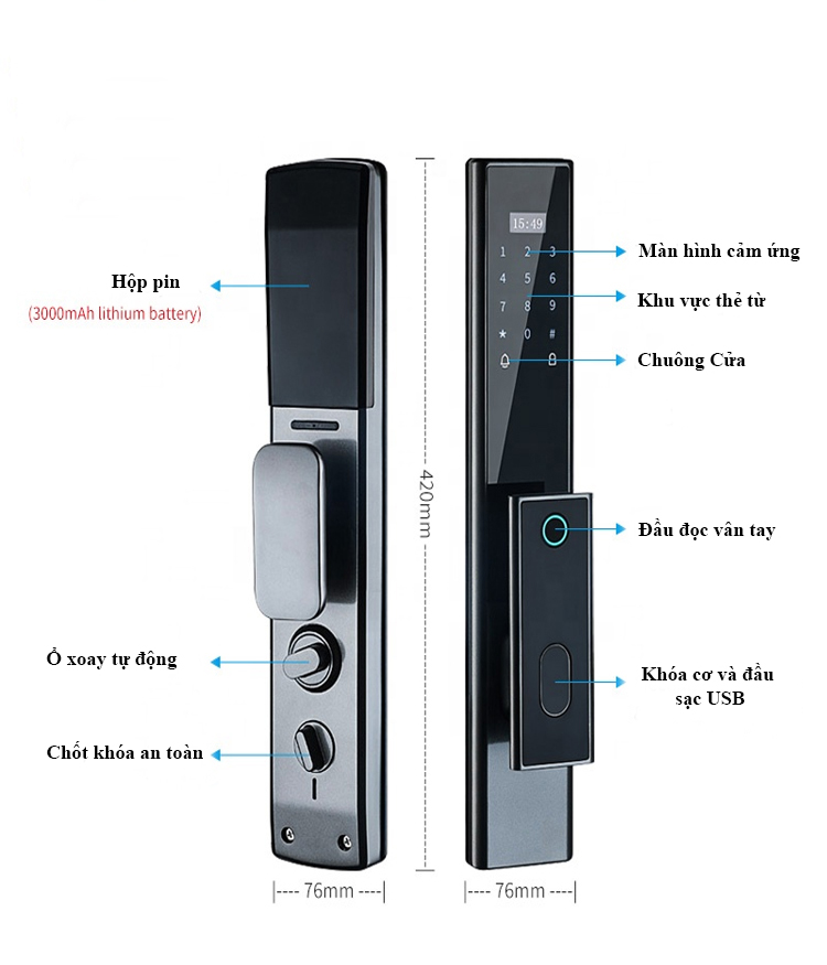 - Cài đặt được 100 mật khẩu, 300 thẻ từ và 300 vân tay.
