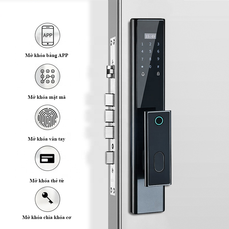 - Khóa cửa gỗ mở bằng vân tay, mã số, thẻ từ, App điện thoại, chìa cơ.