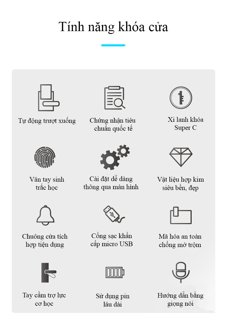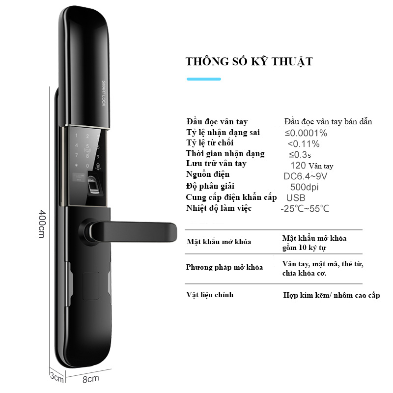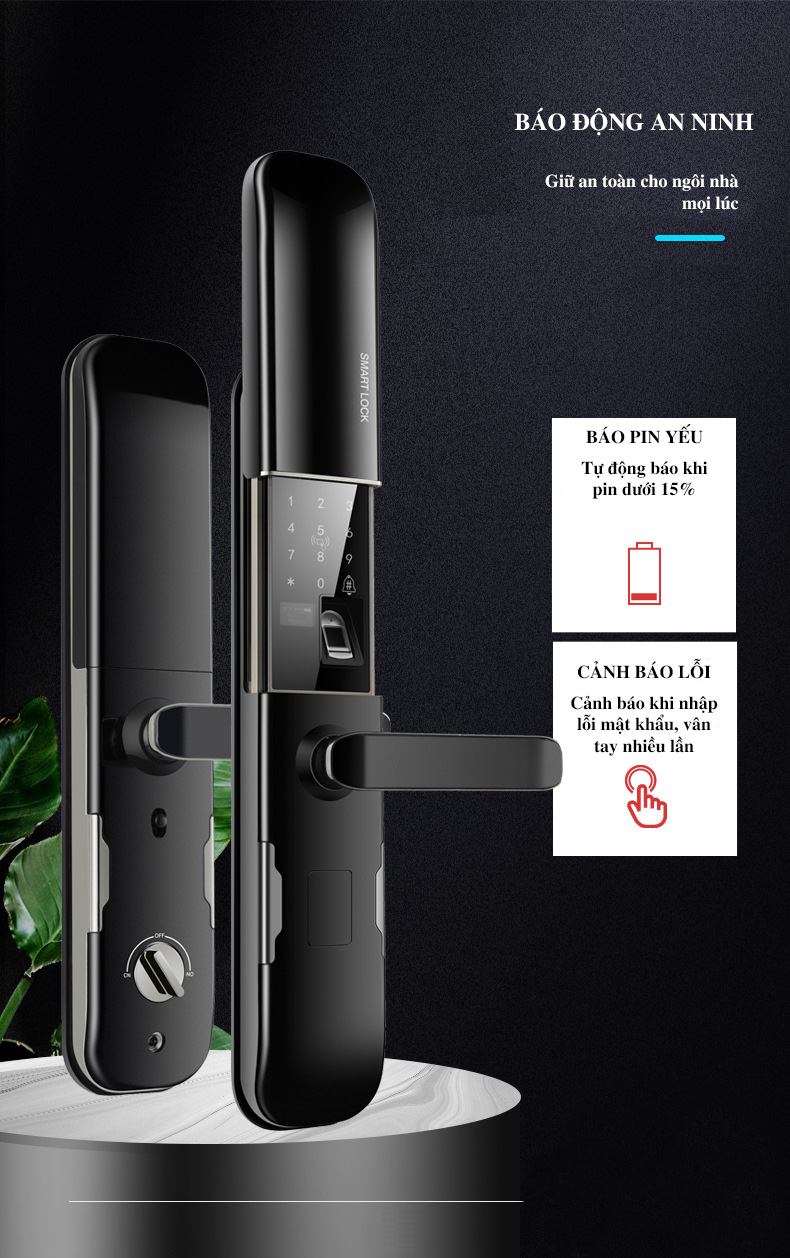 - Chế độ mở cửa: vân tay, mật mã, thẻ từ, chìa khóa cơ,khóa tạm thời, kết hợp vân tay và mật mã