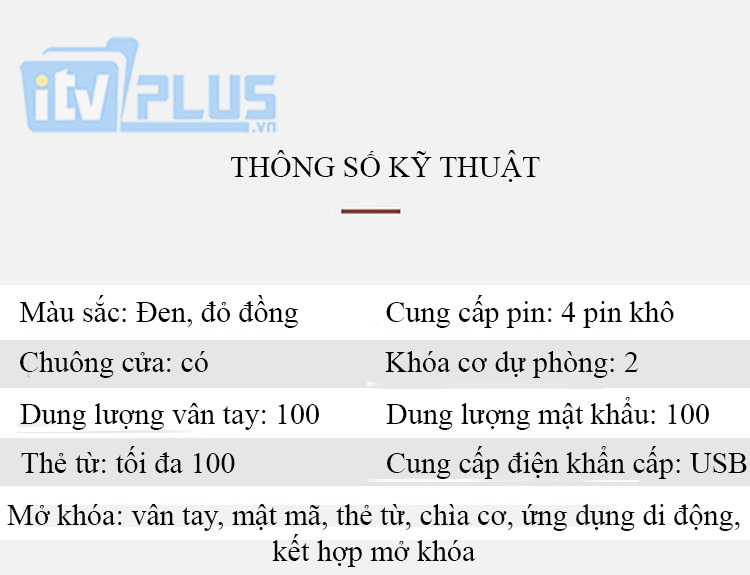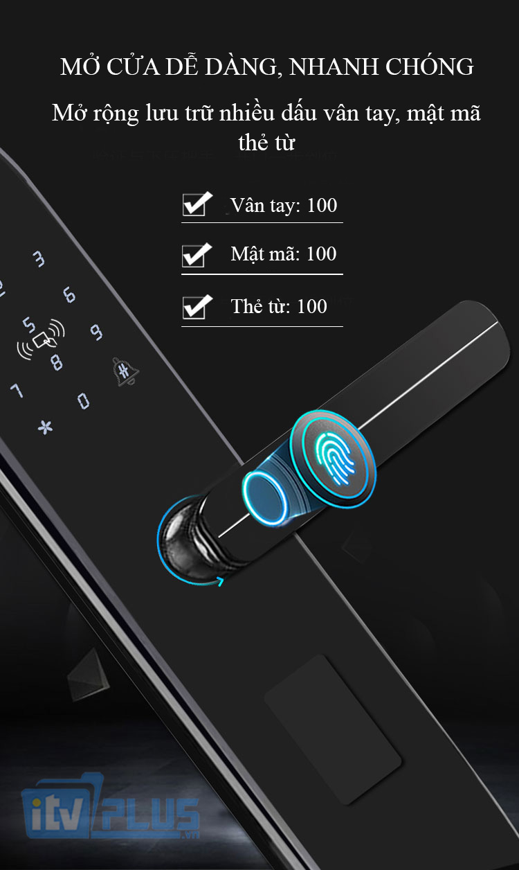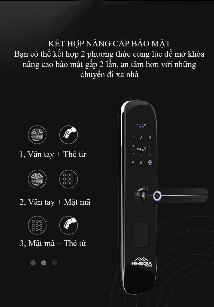 - Chế độ mở cửa: vân tay, mật mã, thẻ từ, chìa khóa cơ, phần mềm di động và kết hợp mở khóa