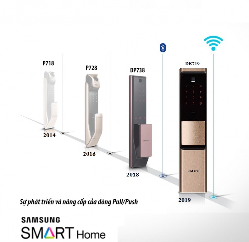 Khóa cửa điện tử Samsung đã là một trong những thương hiệu khóa cửa hàng đầu thế giới. Người tiêu dùng biết đến sản phẩm của Samsung bởi chất lượng tốt và những thiết kế tinh sảo. Không dừng lại ở những dòng khóa cửa điện tử thông dụng, Samsung đã cải tiến và cho ra đời dòng khóa vân tay thông minh Samsung SHP-DR719 có thể kết nối với hệ thống Wifi. Người dùng có thể sử dụng ứng dụng trên điện thoại smartphone để mở khóa từ xa. Đây là sản phẩm đầu tiên của Hàn Quốc ứng dụng công nghệ IOT và tính hữu dụng của nó như: Mở khóa cho người thân khi bạn vắng nhà, quản lý thời gian mở của của các thành viên, kết nối với hệ thông nhà thông minh,….