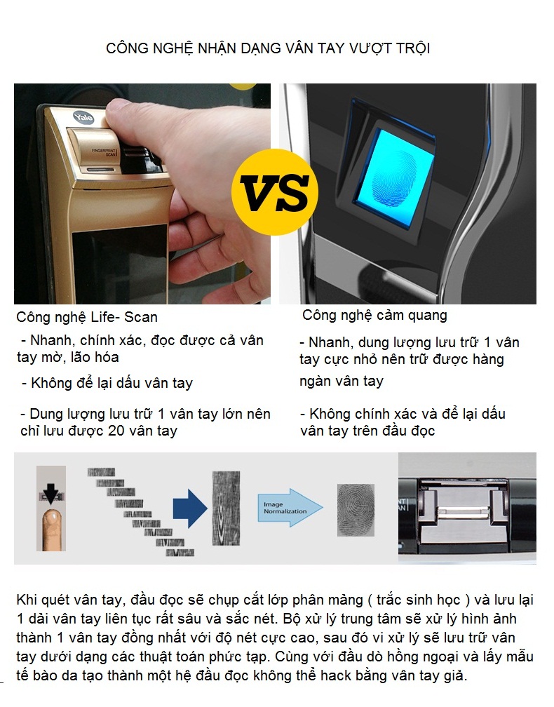 Công nghệ vân tay mới nhất Live-Scan: scan trắc sinh học phân mảng dấu vân tay kết hợp đầu dò hồng ngoại và lấy tế bào da đạt hiệu quả cực nhạy, không phụ thuộc góc quét, chống làm giả, đọc được vân tay mờ, lão hóa.