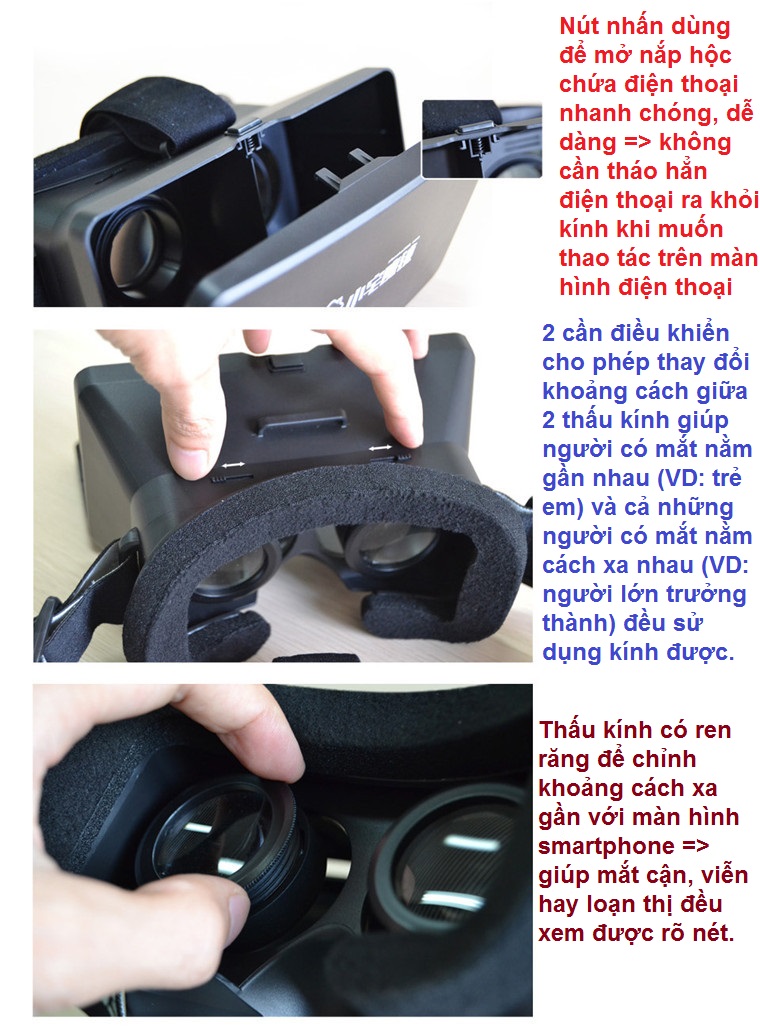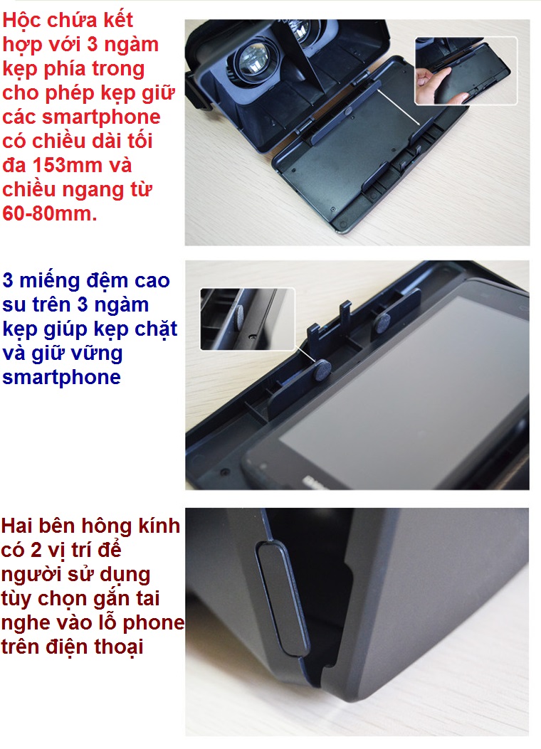 Kính thực tế ảo chuyên dụng này khi kết hợp với smartphone của bạn chạy kèm các ứng dụng thực tế ảo hoặc phim 3D sử dụng công nghệ SBS (Side by Side) bằng cách chia màn hình Smartphone ra thành 2 hình ảnh tương tự như nhau cho mắt trái và mắt phải riêng biệt => sẽ tạo thành hiệu ứng 3D với màu sắc trung thực hơn cả khi bạn coi ngoài rạp chiếu phim chuyên nghiệp với màn hình cực lớn và hình ảnh lòi hẳn ra ngoài màn hình với các cảnh vật thể bay ra phía ngoài màn hình và bạn phải giật mình né tránh vì nó y như thật. Bạn sẽ chìm đắm thực sự trong không gian thực tế ảo với các ứng dụng thực tế ảo vì bạn có thể chủ động điều khiển góc nhìn của mắt khi ngước đầu nhìn lên xuống, quay đầu sang trái phải,...bạn sẽ cảm thấy mình thực sự bước vào 1 không gian thế giới ảo "song song" với thế giới thực tại của mình. Nói chính xác hơn là không một ngòi bút nào có thể diễn tả được cảm xúc khi lần đầu tôi được trải nghiệm với kính thực tế ảo này với các ứng dụng thực tế ảo xuất sắc từ chợ ứng dụng của Google (Google Play).