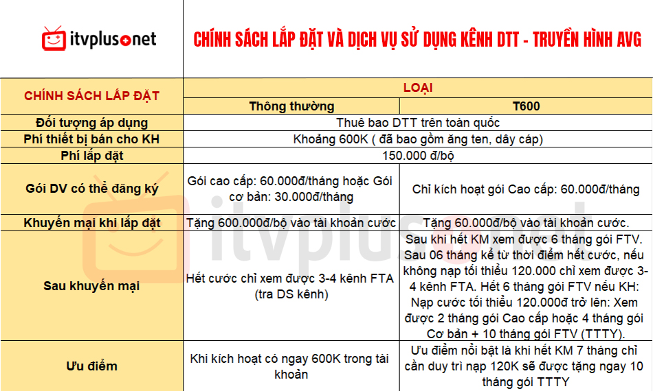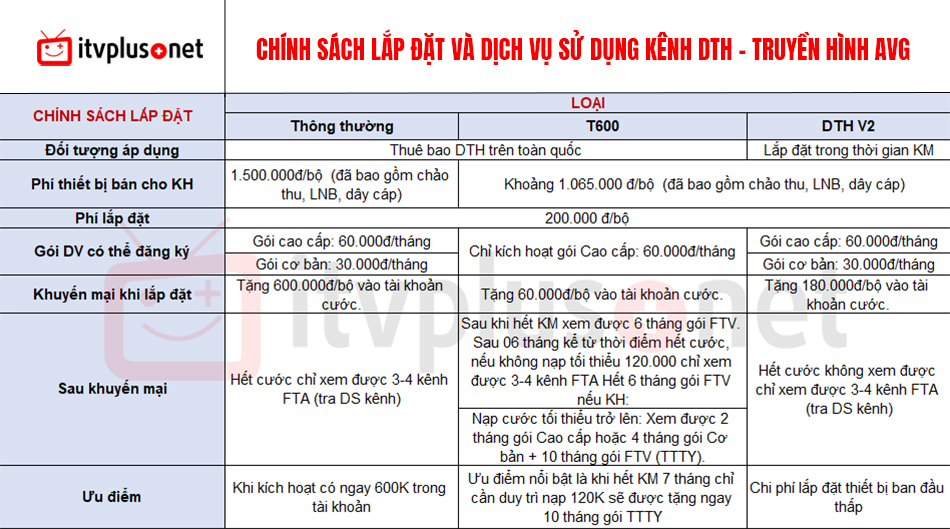 Lắp đặt truyền hình AVG trên toàn quốc giá rẻ - uy tín – chuyên nghiệp. ITVPlus chuyên cung cấp và lắp đặt thiết bị và dịch vụ xem truyền hình đa kênh tại Việt Nam. Với số lượng kênh lên đến 200 kênh, chuẩn độ phân giải HD 720P, Full HD 1080P và SD.