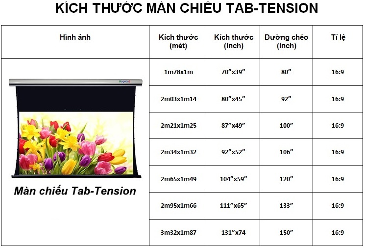 Màn Chiếu Tab Tension 150inch với độ mịn cao, chống bóng lóa, cho chất lượng hình ảnh sắc nét, trung thực ấn tượng, tỷ lệ 16:9
