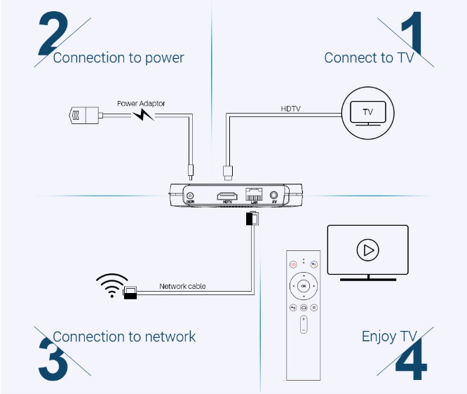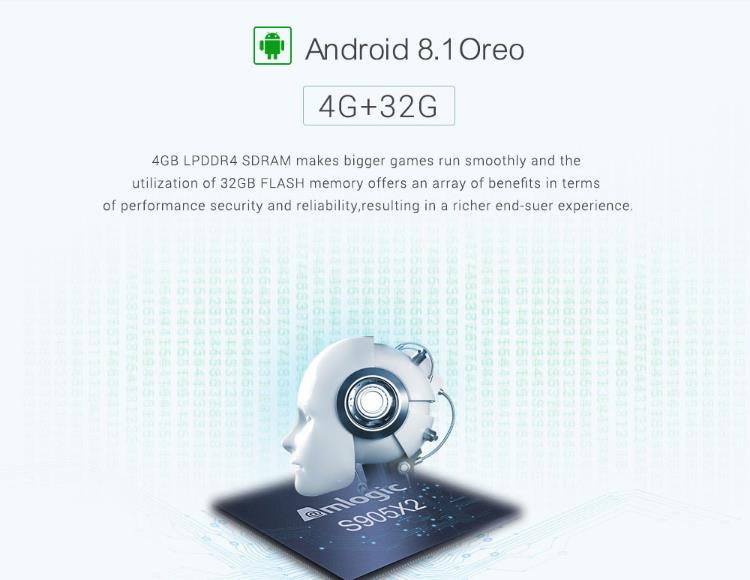 - Cấu hình mạnh mẽ với thế hệ chip xử lý mới nhất Amlogic S905x2 64Bit, GPU Mail-G31 MP2, Ram 4GB, Rom 32GB mang lại một tốc độ xử lý rất nhanh và chất lượng hình ảnh 4K sắc nét.