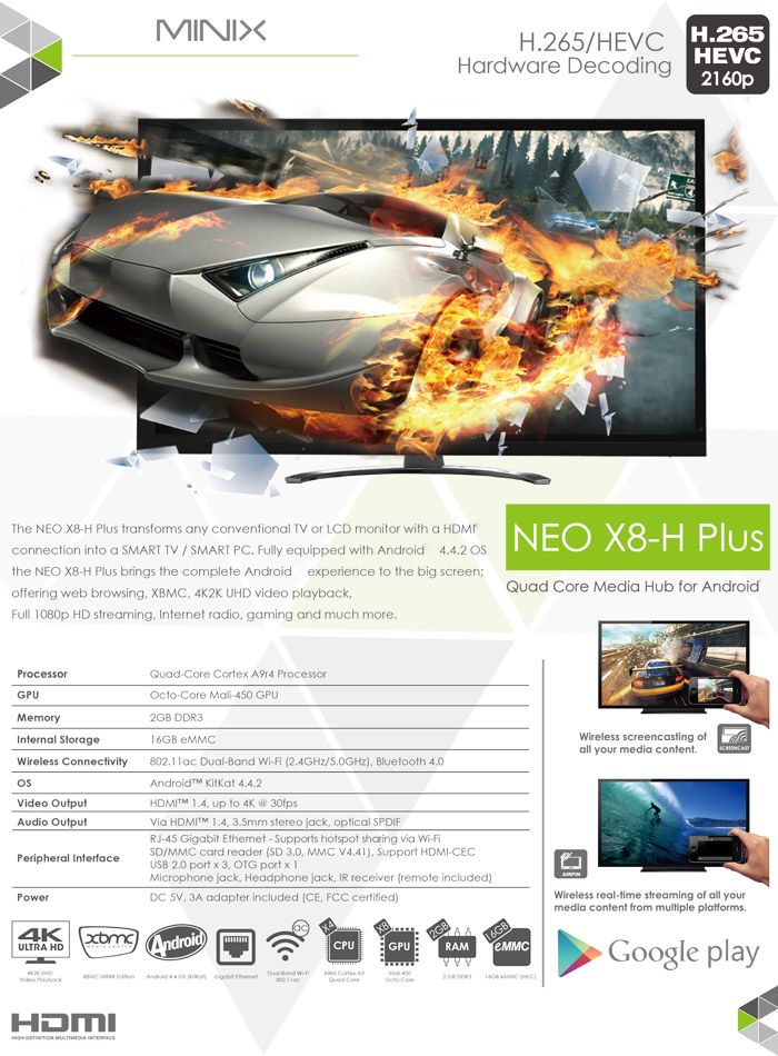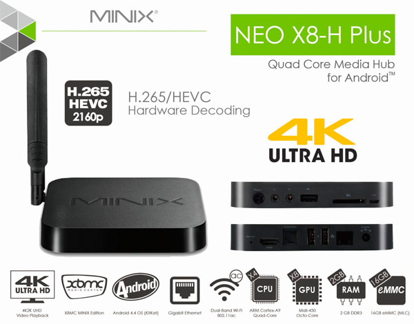 Minix NEO X8 -H Plus sẽ thỏa mãn với khả năng phát video 4K2K UHD mượt mà vượt bậc từ bất kỳ nguồn phát nào, giải mã 3D, ISO Bluray âm thanh DD/DD+/DTS kèm bộ xử lý hình ảnh độc quyền từ Minix giúp nâng cao kết cấu màu sắc và họa tiết cho hình ảnh rõ nét, chiều sâu ấn tượng và màu sắc tự nhiên.