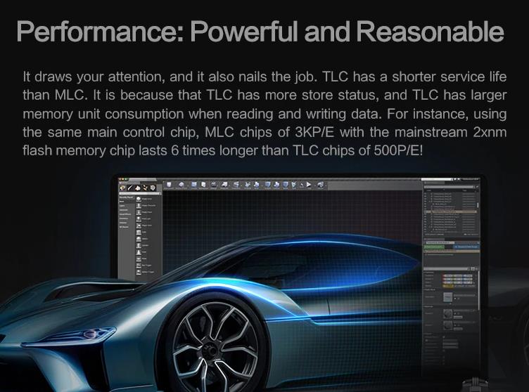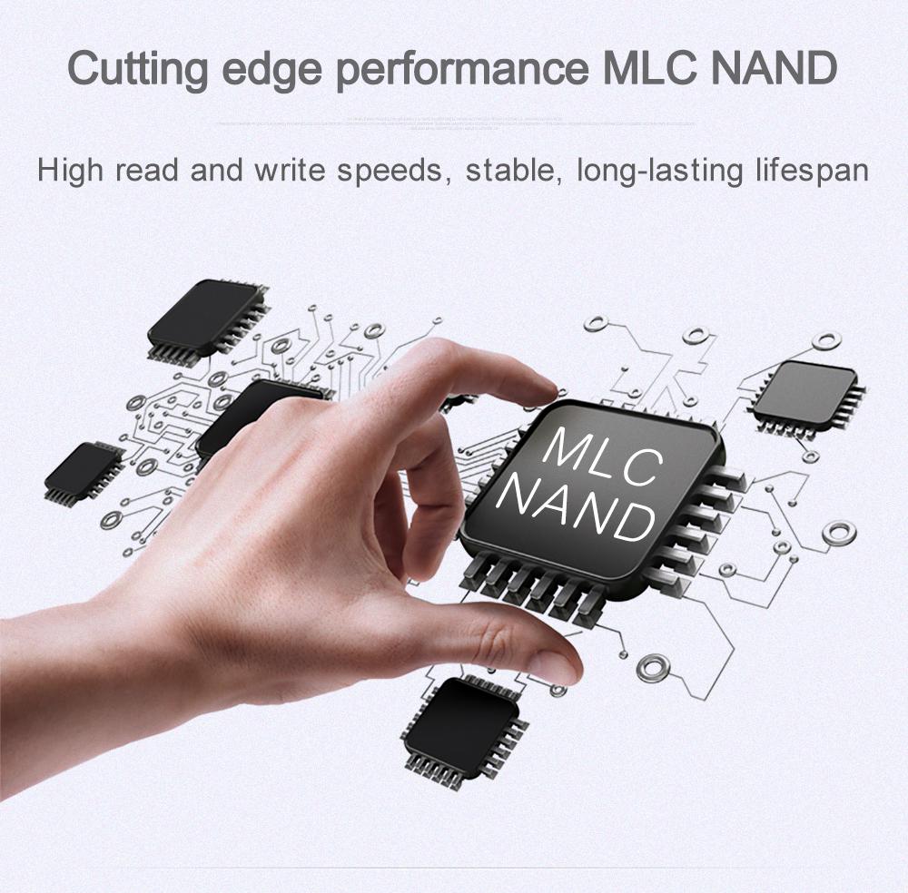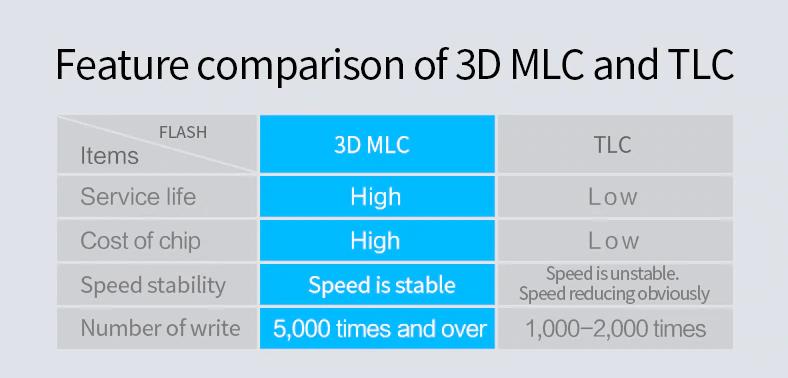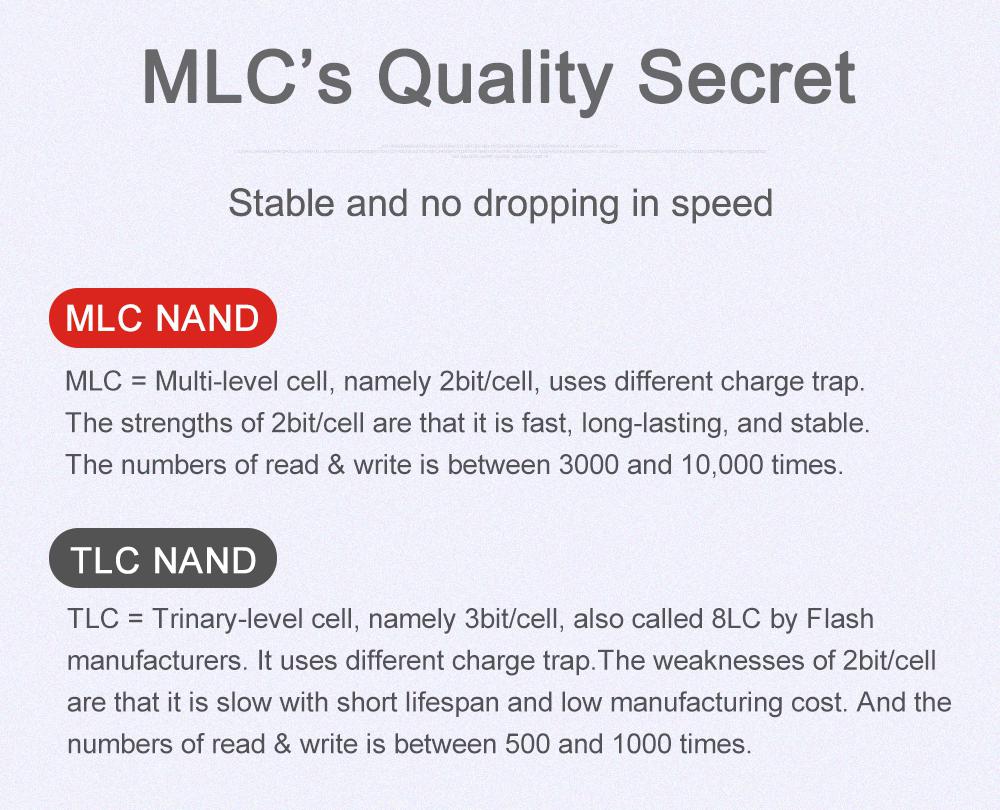 Công nghệ chip nhớ MLC hoàn toàn vượt trội so với công nghệ TLC. Điểm mạnh là nhanh, lâu dài và ổn đinh. Số lần đọc ghi giao động từ 3000 đến 10.000 lần. Trong khi đó các SSD sử dụng công nghệ chip nhớ TCL thì số lần đọc ghi chỉ dao động từ 500 đến 1000 lần.