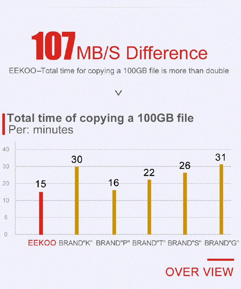 Tổng thời gian sao chép tệp tin dung lượng 100GB của SSD EEKOO là nhanh hơn gấp đôi so với đối thủ. Tốc độ chênh lệch 107MB/s.