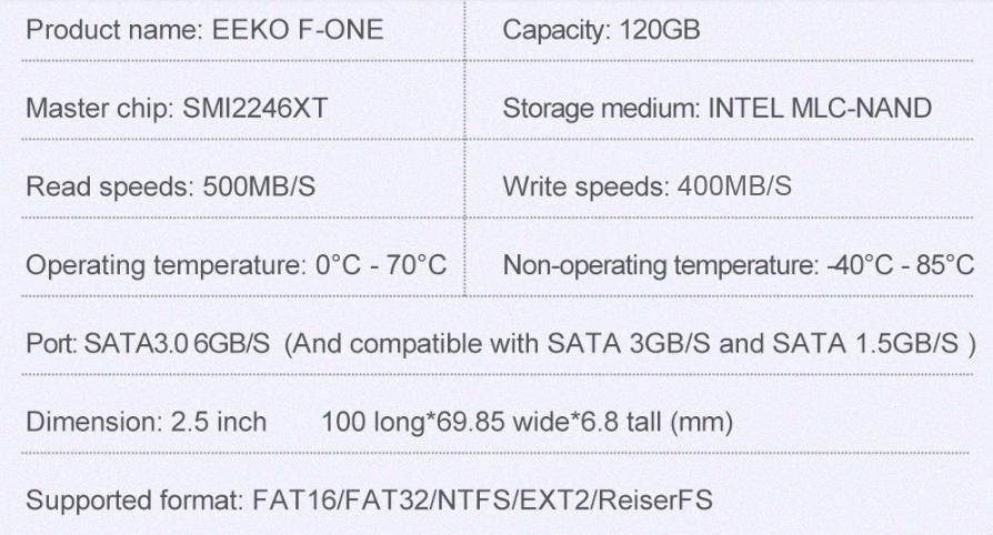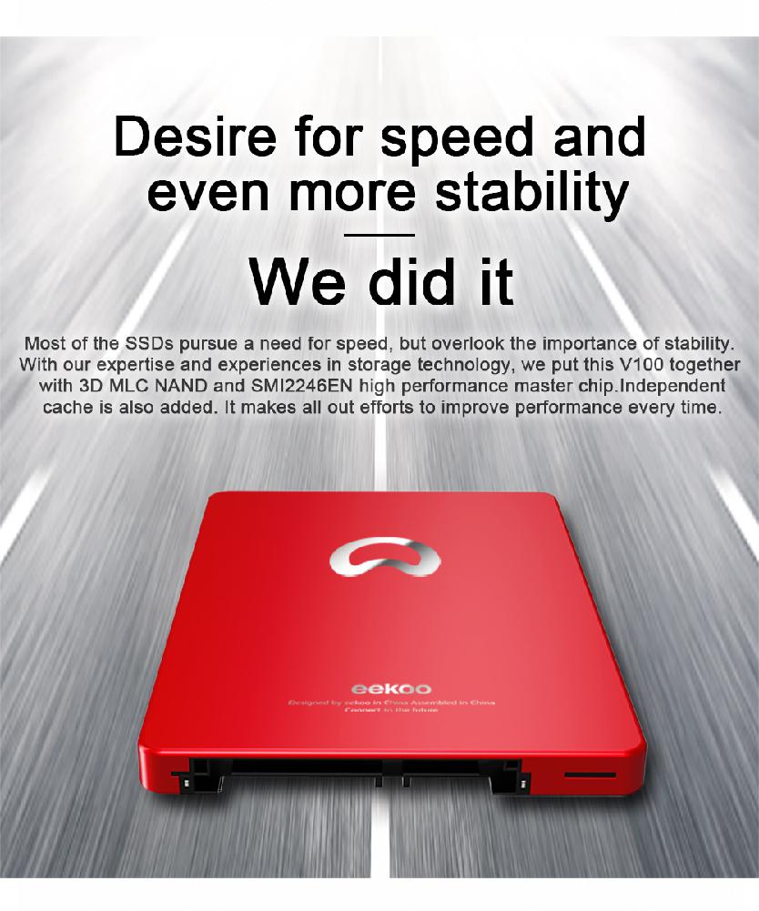 Với hầu hết các SSD đều chỉ theo đuổi nhu cầu về tốc độ nhưng lại bỏ qua tầm quan trọng của sự ổn định. Để có được tốc độ và một mong muốn ổn định hơn, EEKOO đã thực hiện được điều đó. Cùng với chuyên môn và kinh nghiệm trong công nghệ lưu trữ, hãng đã đưa vào các model SSD V-100, F-ONE chip nhớ hiệu suất cao 3D MLC NAND và chip xử lý SMI2246EN, bộ nhớ cache riêng cũng được thêm vào, điều này làm tăng hiệu xuất đáng kể đi kèm sự ổn định cao.