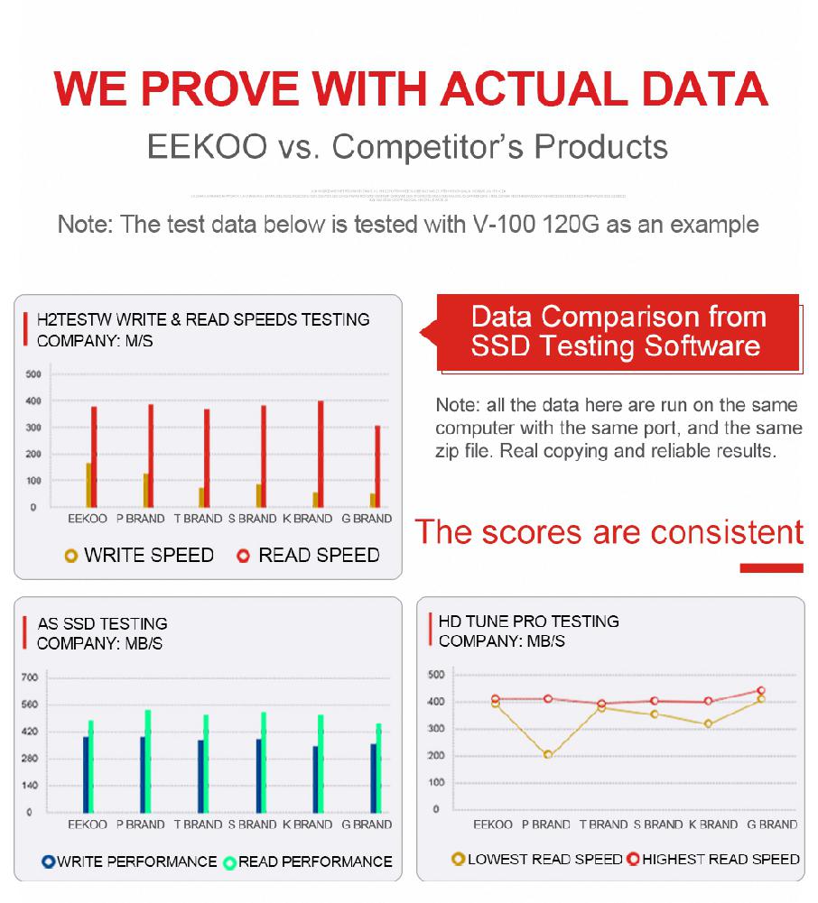 Kết quả so sánh với dữ liệu thực tế, SSD EEKOO và các sản phẩm đối thủ. Ở đây EEKOO test SSD 120GB với các đối thủ có dung lượng tương đương.