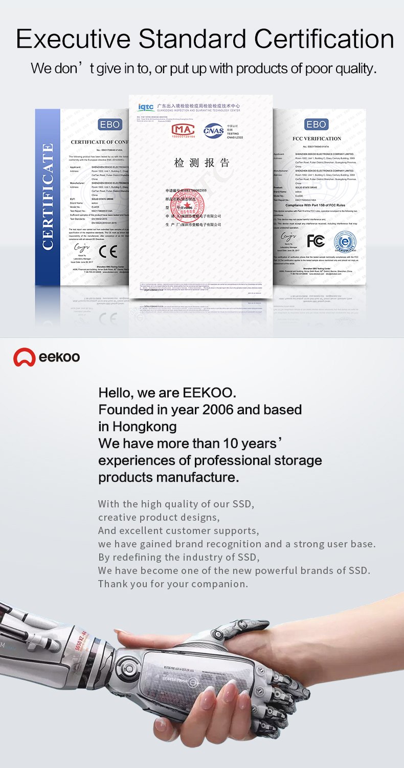 EEKOO được thành lập vào năm 2006, trụ sở được đặt ở Hồng Kông, có 10 năm kinh nghiệm trong lĩnh vực sản xuất các thiết bị lưu trữ chuyên nghiệp. Các sản phẩm về SSD luôn có chất lượng cao, thiết kế sáng tạo và hỗ trợ khách hàng một cách tốt nhất. EEKOO đạt được các chứng nhận về tiêu chuẩn CE, FCC, hãng cam kết không đưa ra các sản phẩm kém chất lượng đến người tiêu dùng.